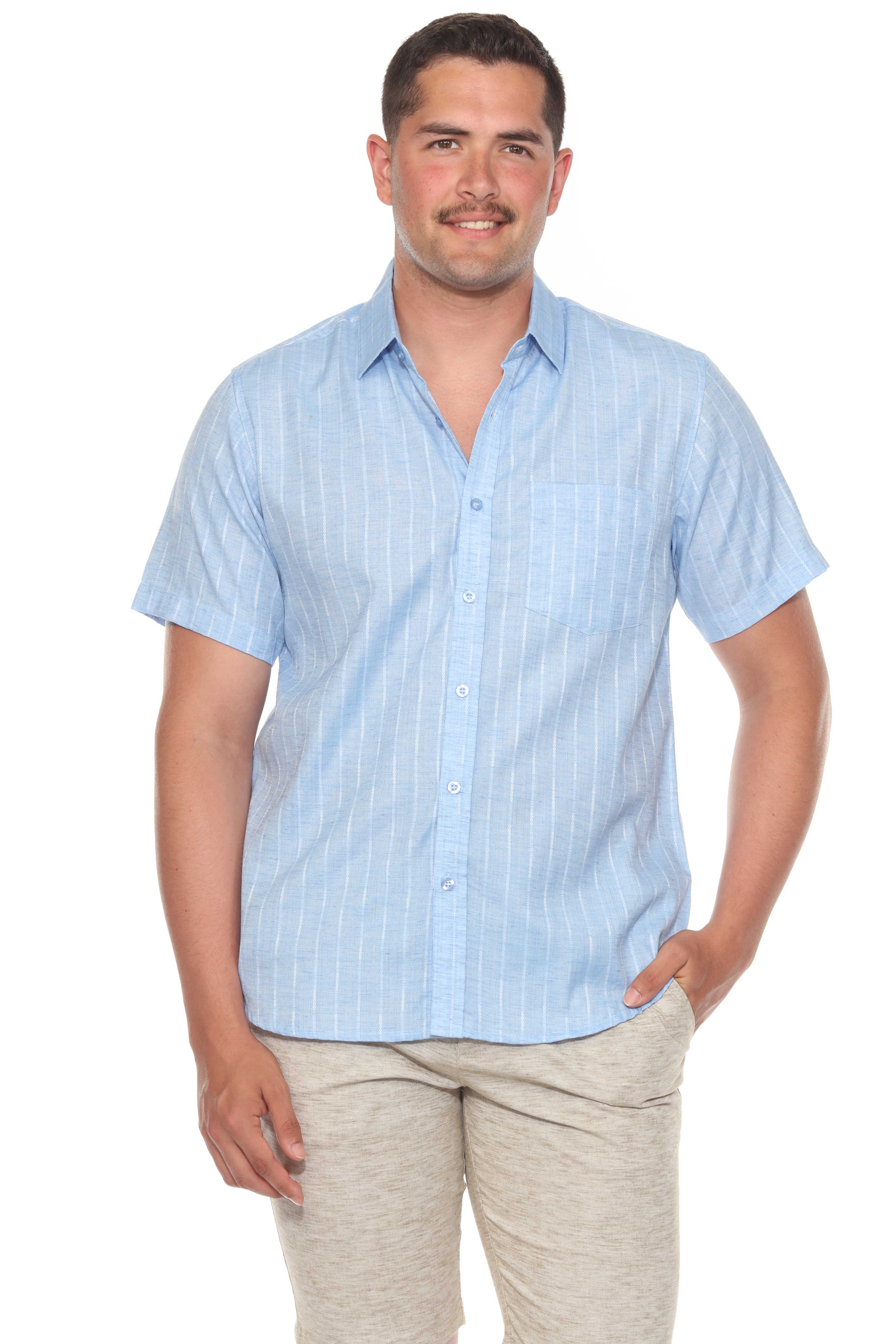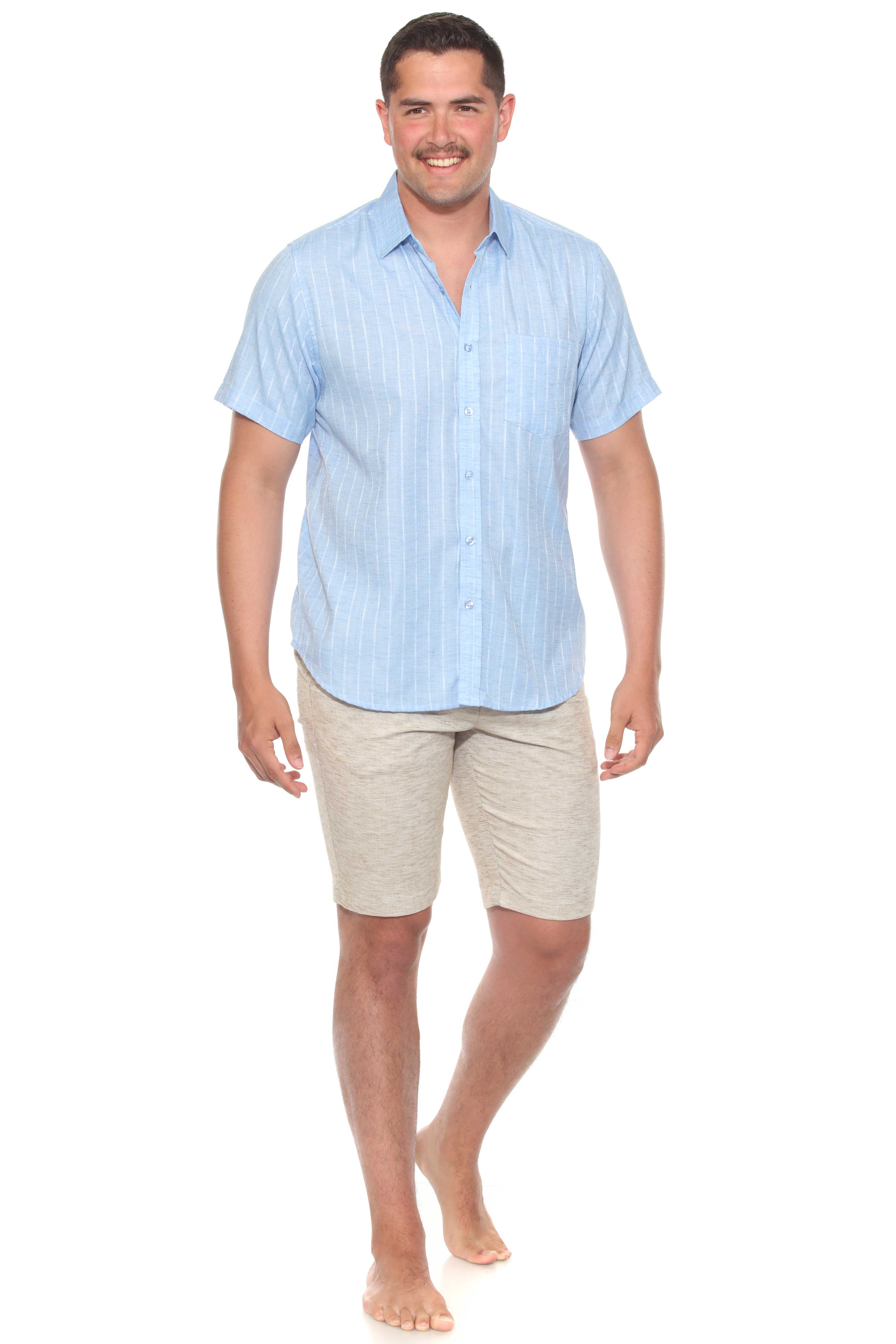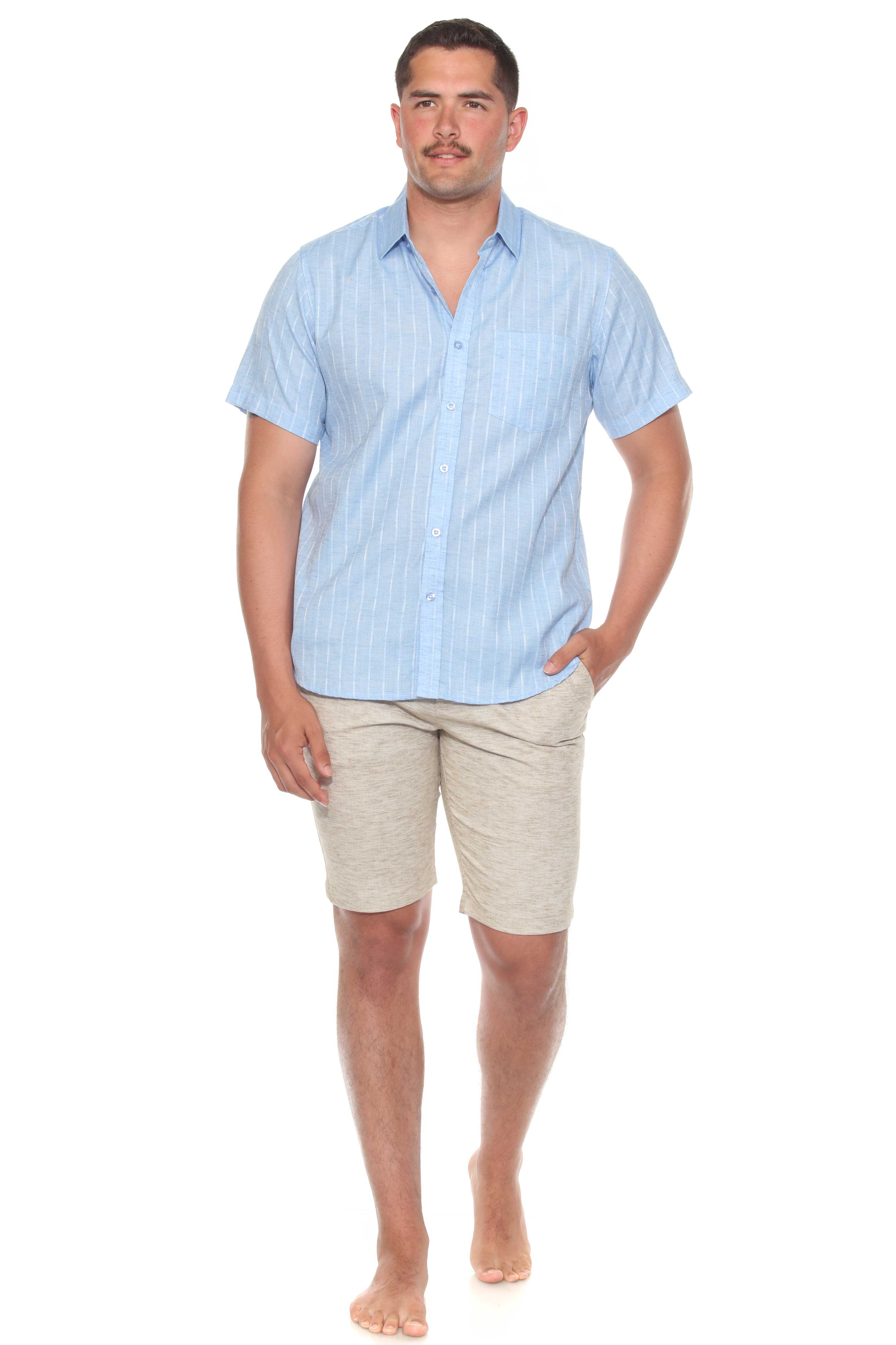 Elevate your resort style with this short sleeve button-up crafted from a lightweight cotton blend fabric. Featuring a pinstripe print and a casual rolled sleeves, designed for effortless warm-weather refinement.