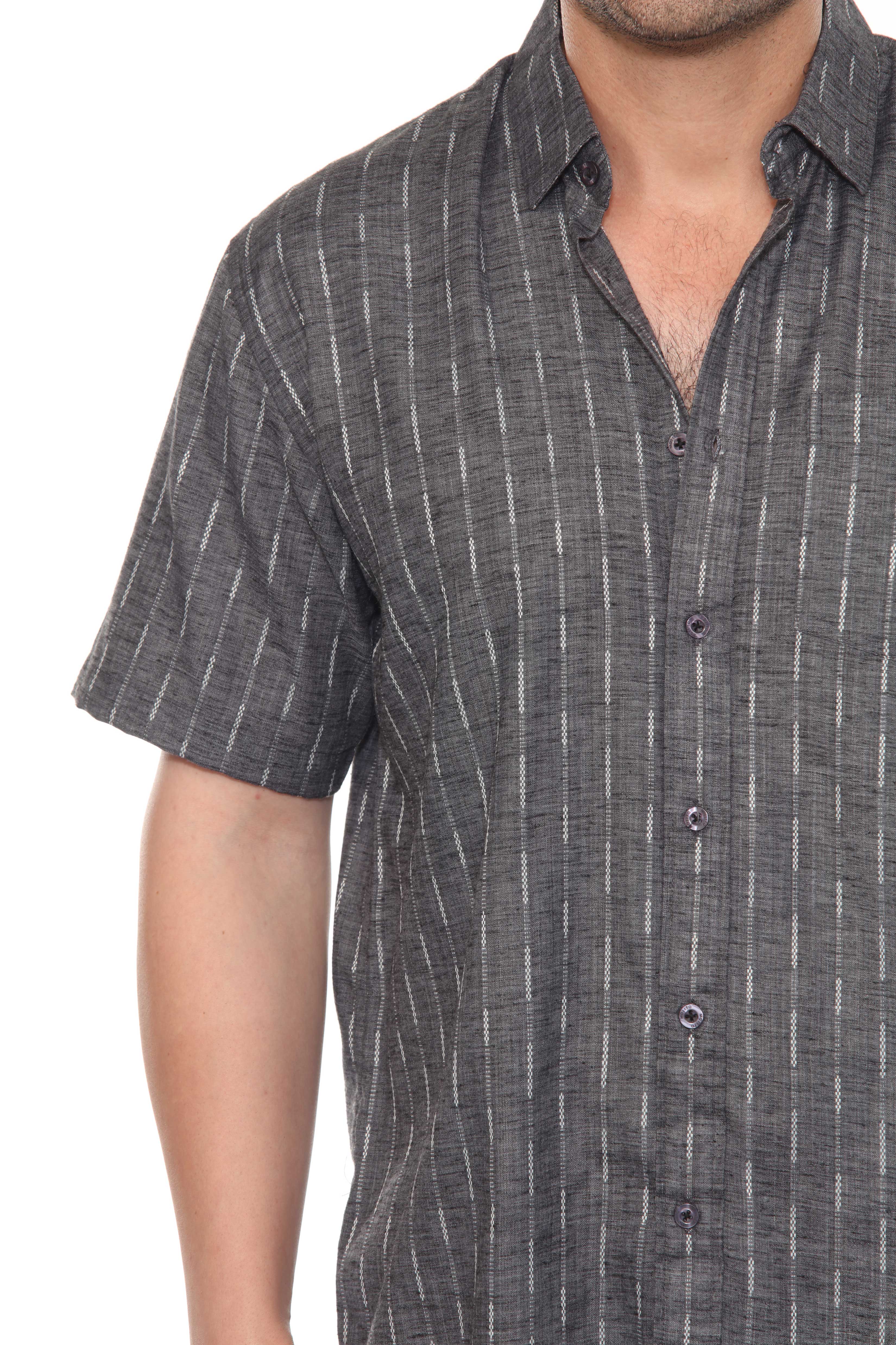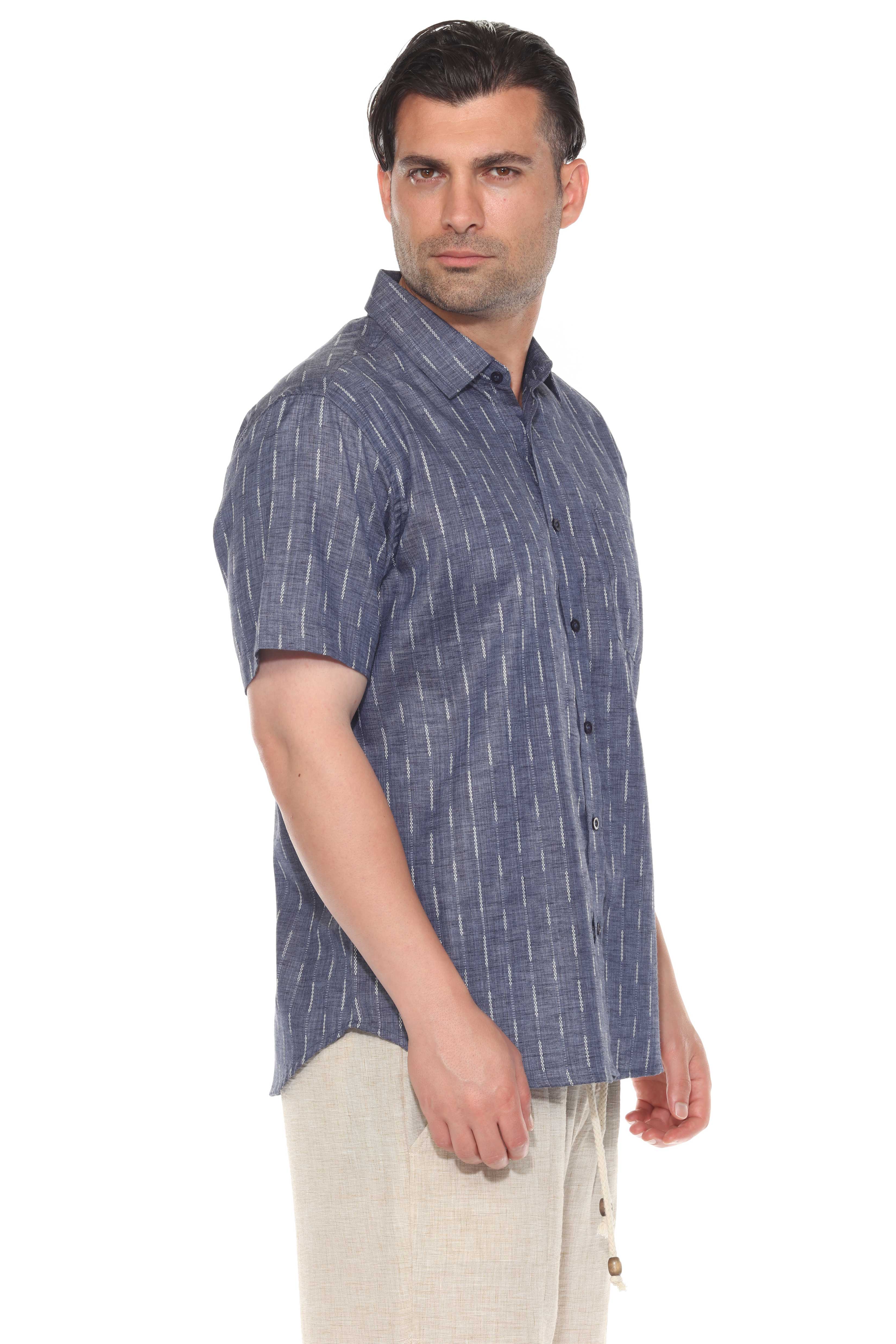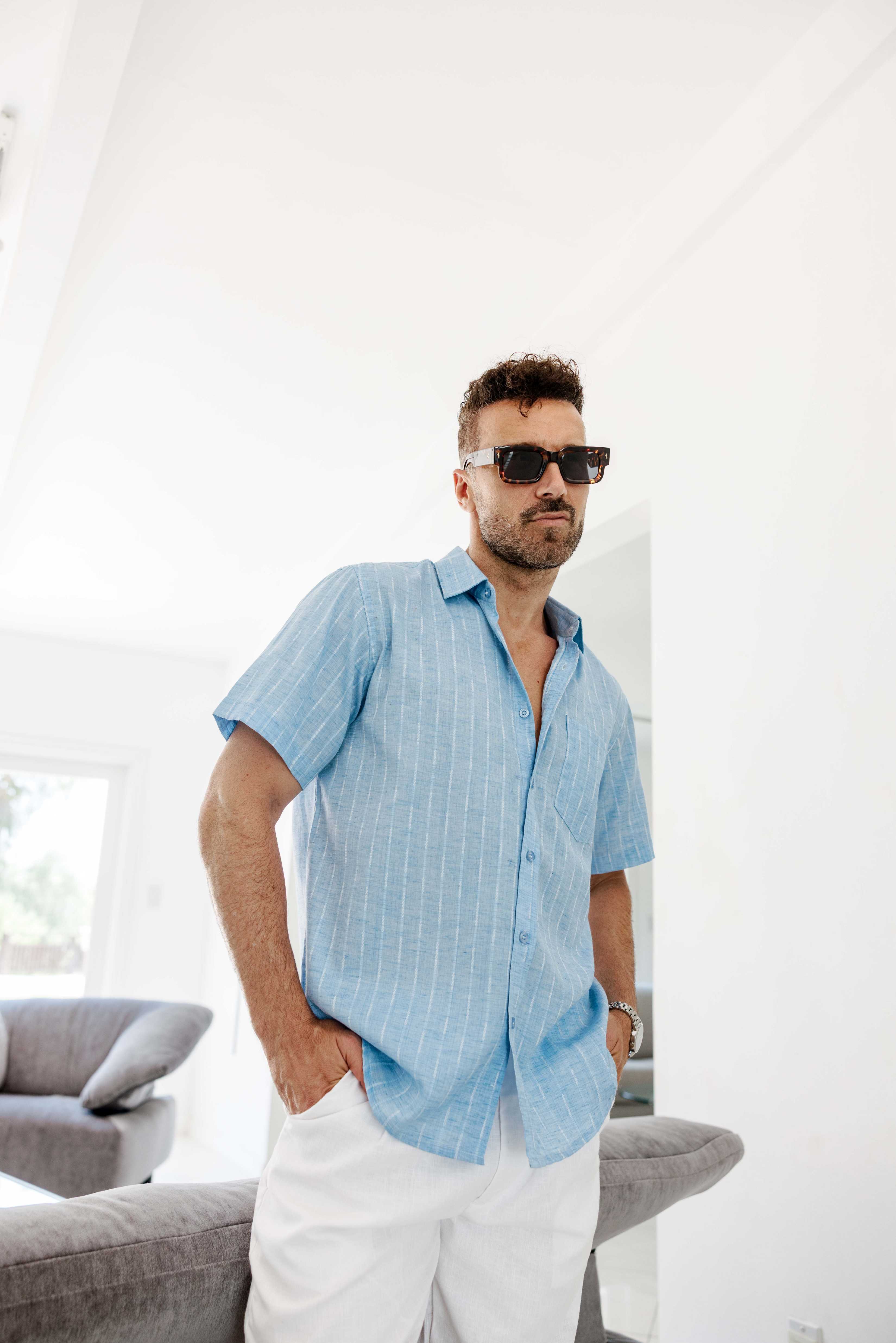 Elevate your resort style with this short sleeve button-up crafted from a lightweight cotton blend fabric. Featuring a pinstripe print and a casual rolled sleeves, designed for effortless warm-weather refinement.