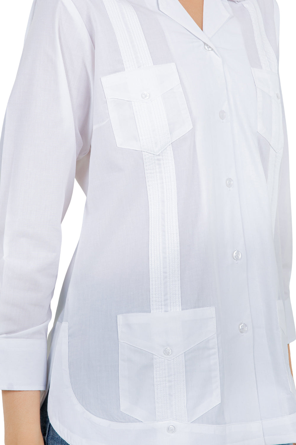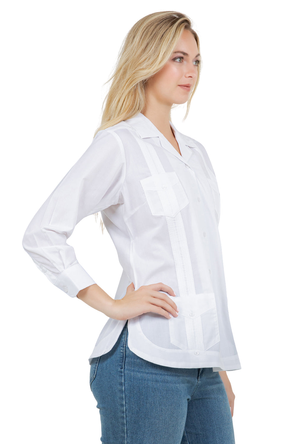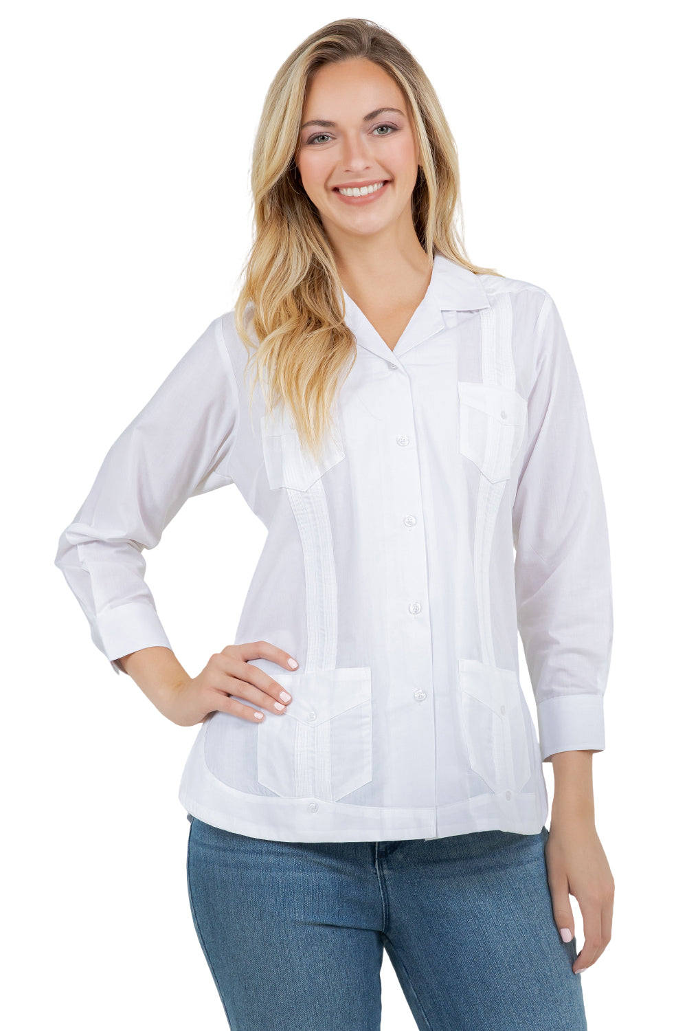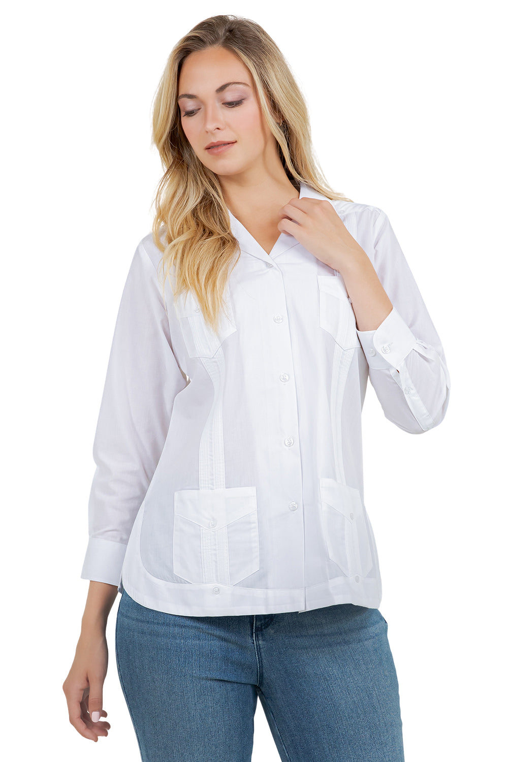 Women's all-time bestseller, this women’s guayabera long sleeve shirt is available in sizes XS to 4X for an inclusive, flattering fit. Designed with authentic 4-pocket styling and made from a soft, breathable cotton-blend fabric, it delivers timeless elegance with everyday comfort.