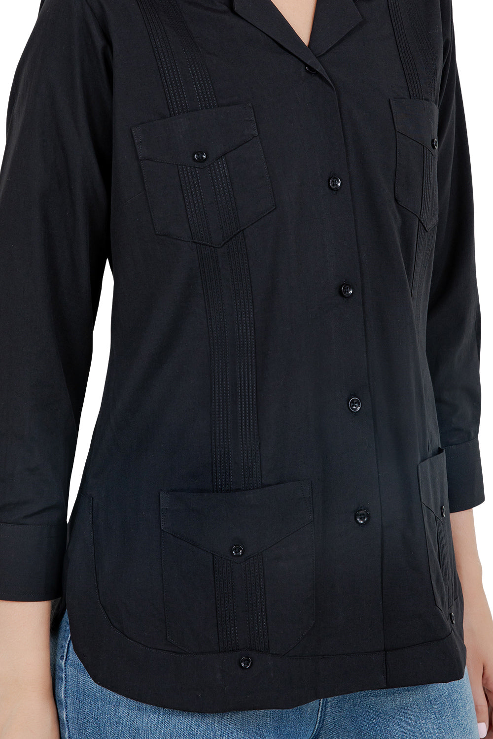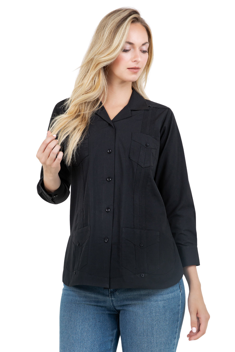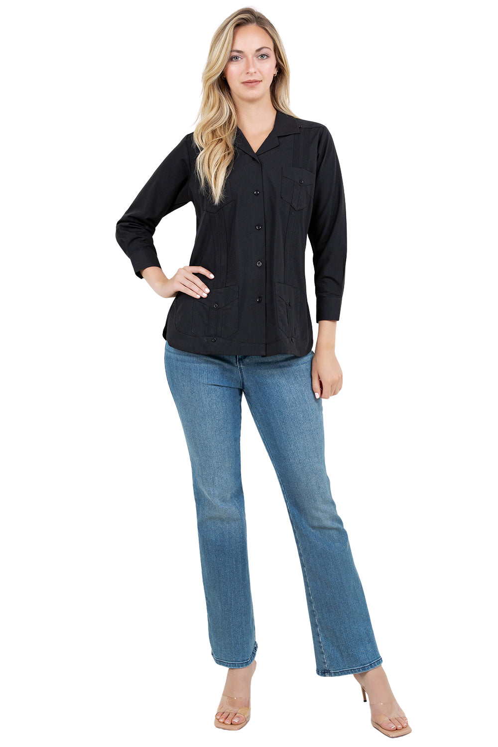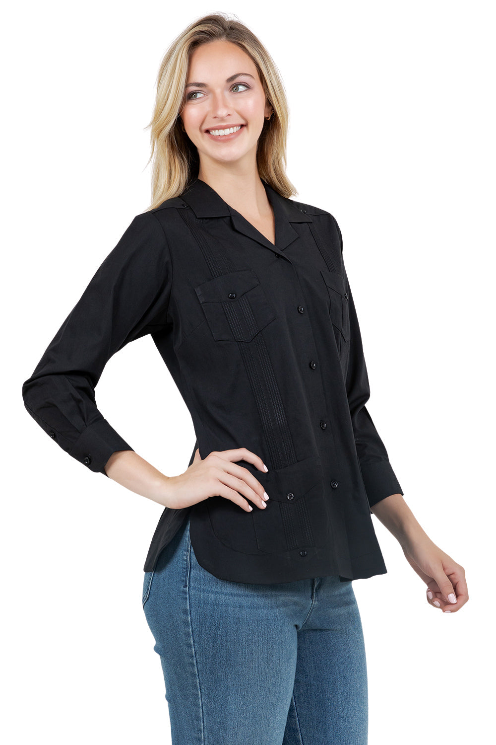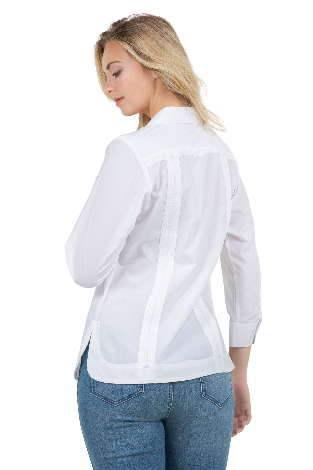 Women's all-time bestseller, this women’s guayabera long sleeve shirt is available in sizes XS to 4X for an inclusive, flattering fit. Designed with authentic 4-pocket styling and made from a soft, breathable cotton-blend fabric, it delivers timeless elegance with everyday comfort.