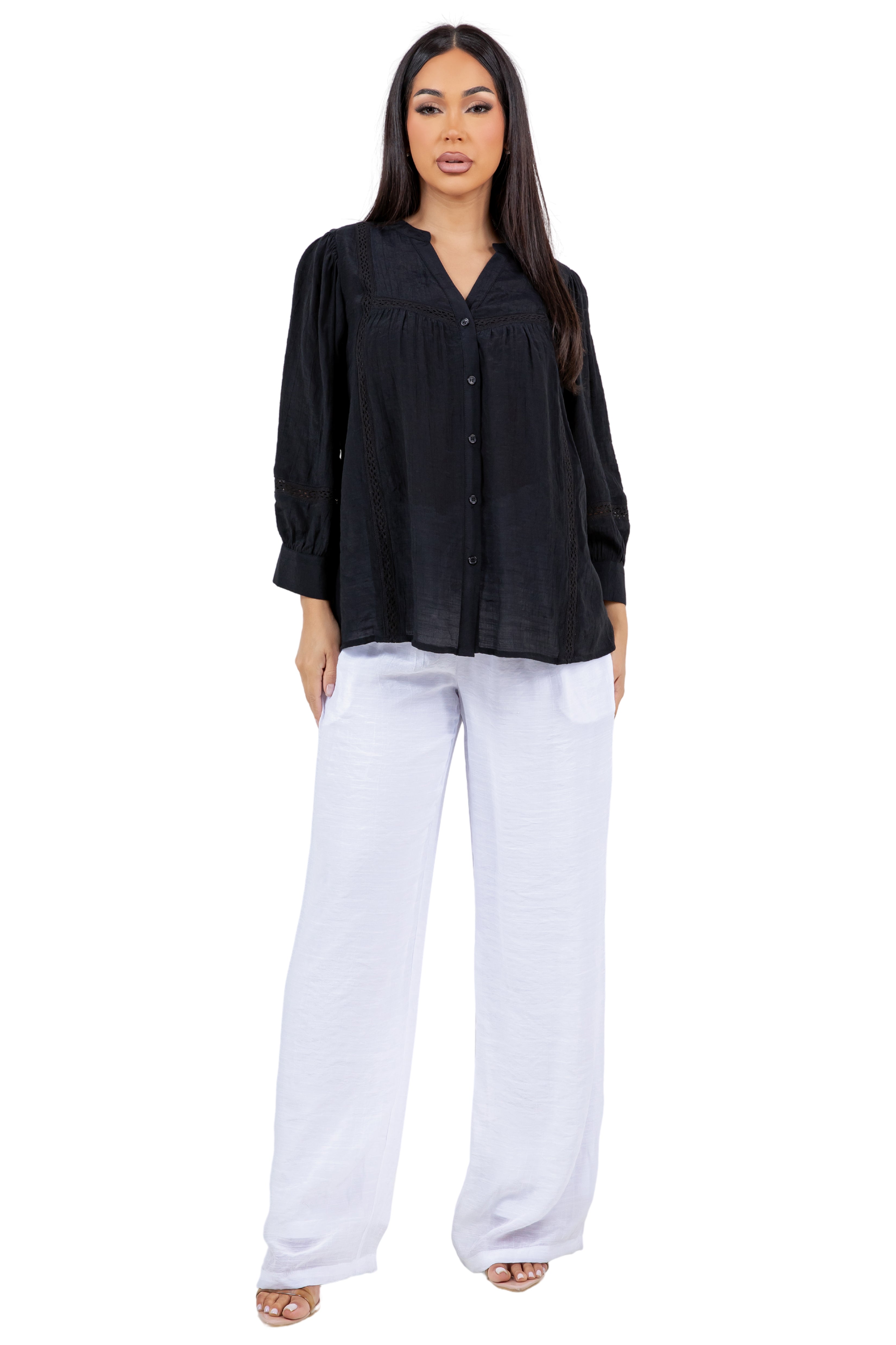 • 3/4 Puff Sleeves with Cuffs: Gently gathered at the shoulders with lace insets and wide buttoned cuffs, the sleeves give the blouse a romantic, airy finish.