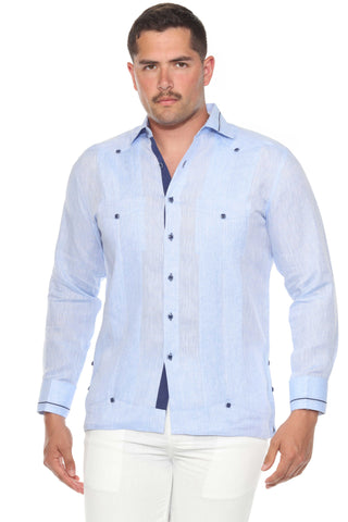 Mojito Men's 100% Linen Guayabera Chacabana Shirt Long Sleeve - Contrast Vertical & Collar Accent Trim