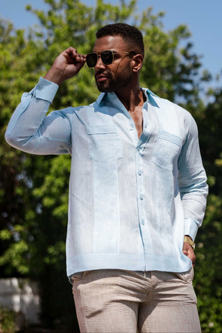 Mojito Men's 100% Linen Guayabera Chacabana Shirt Long Sleeve with Contrast Trim & Modern Pleats