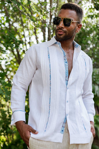 Mojito Men's 100% Linen Guayabera Chacabana Shirt Long Sleeve - Floral Contrast Trim & Blue Embroidery