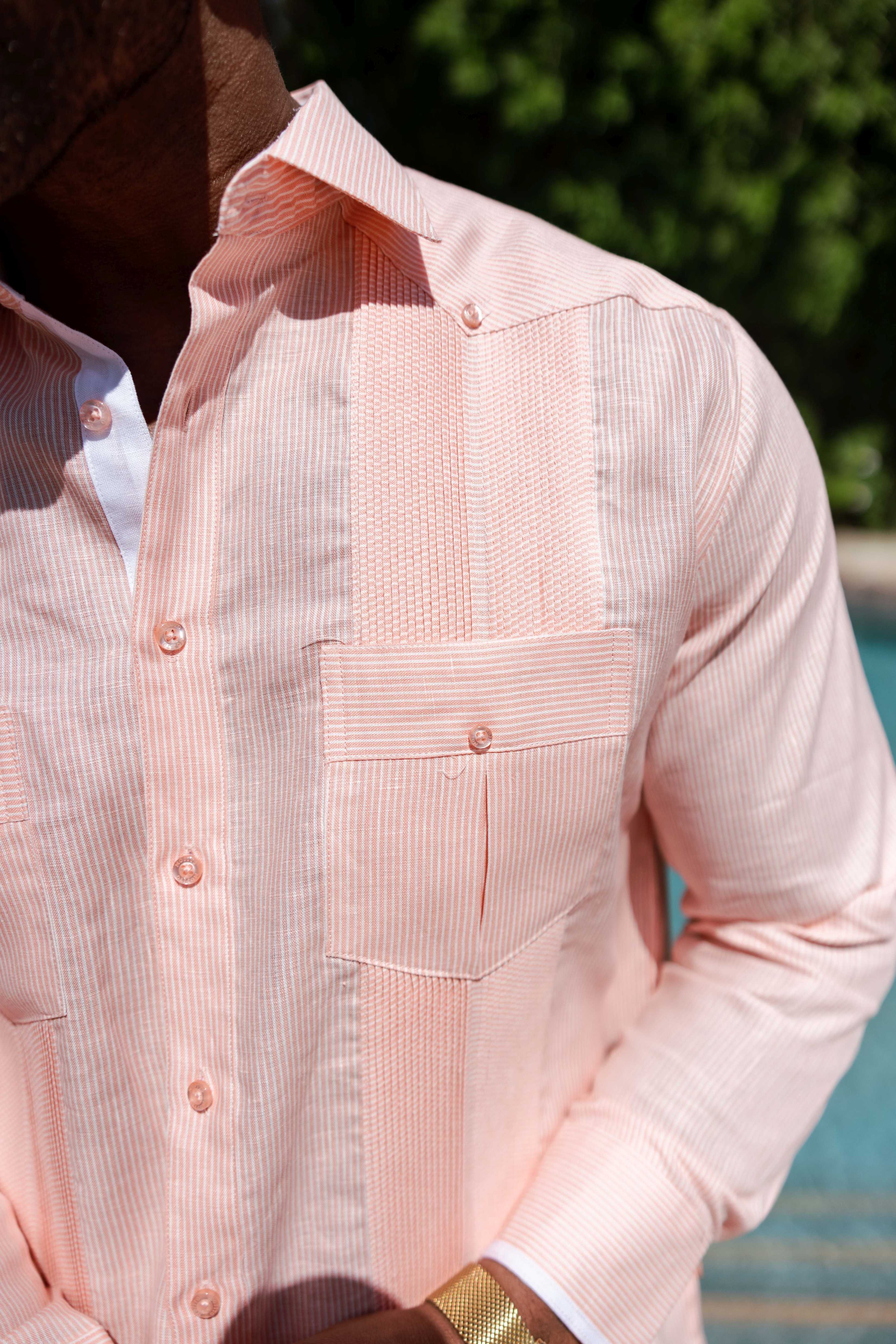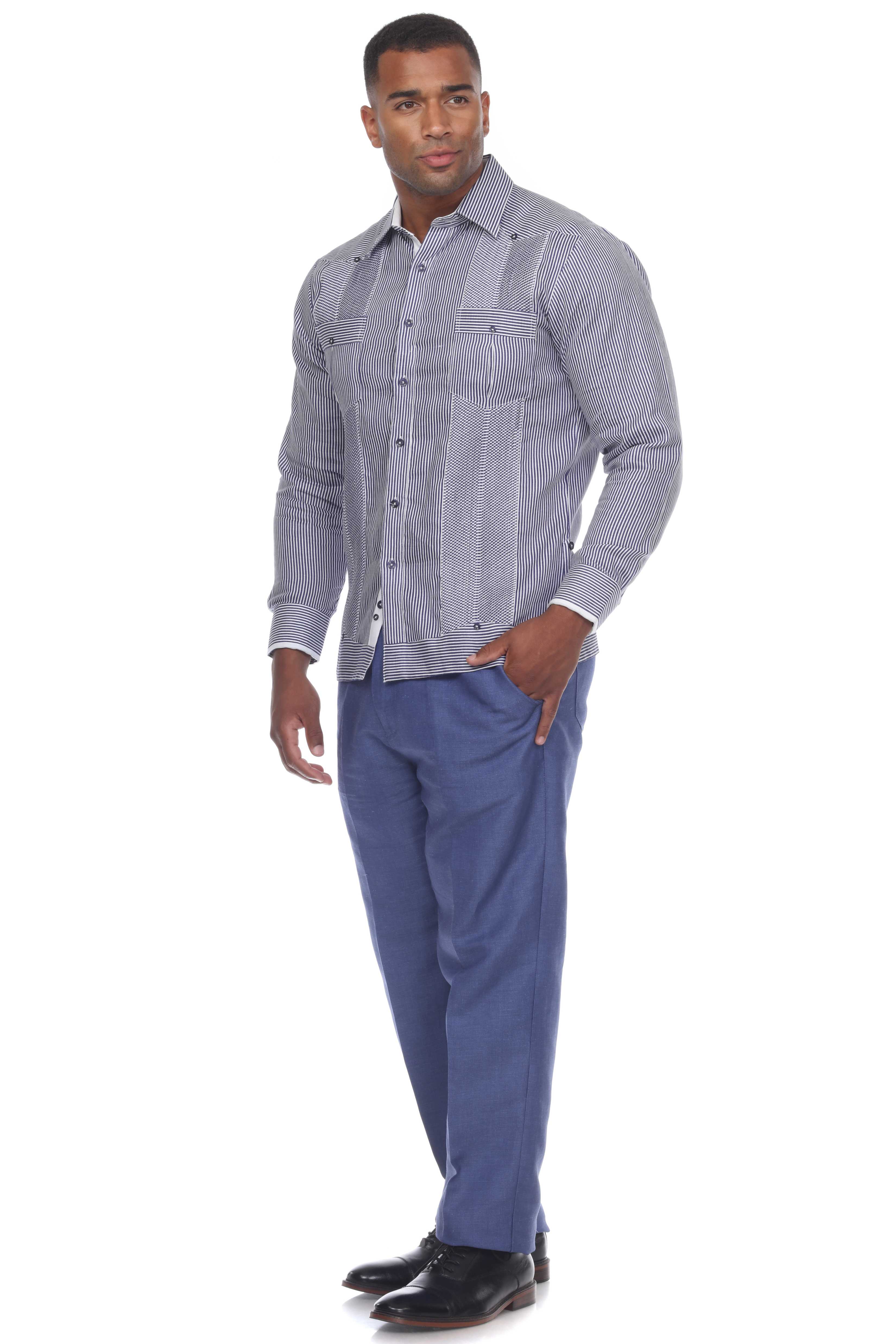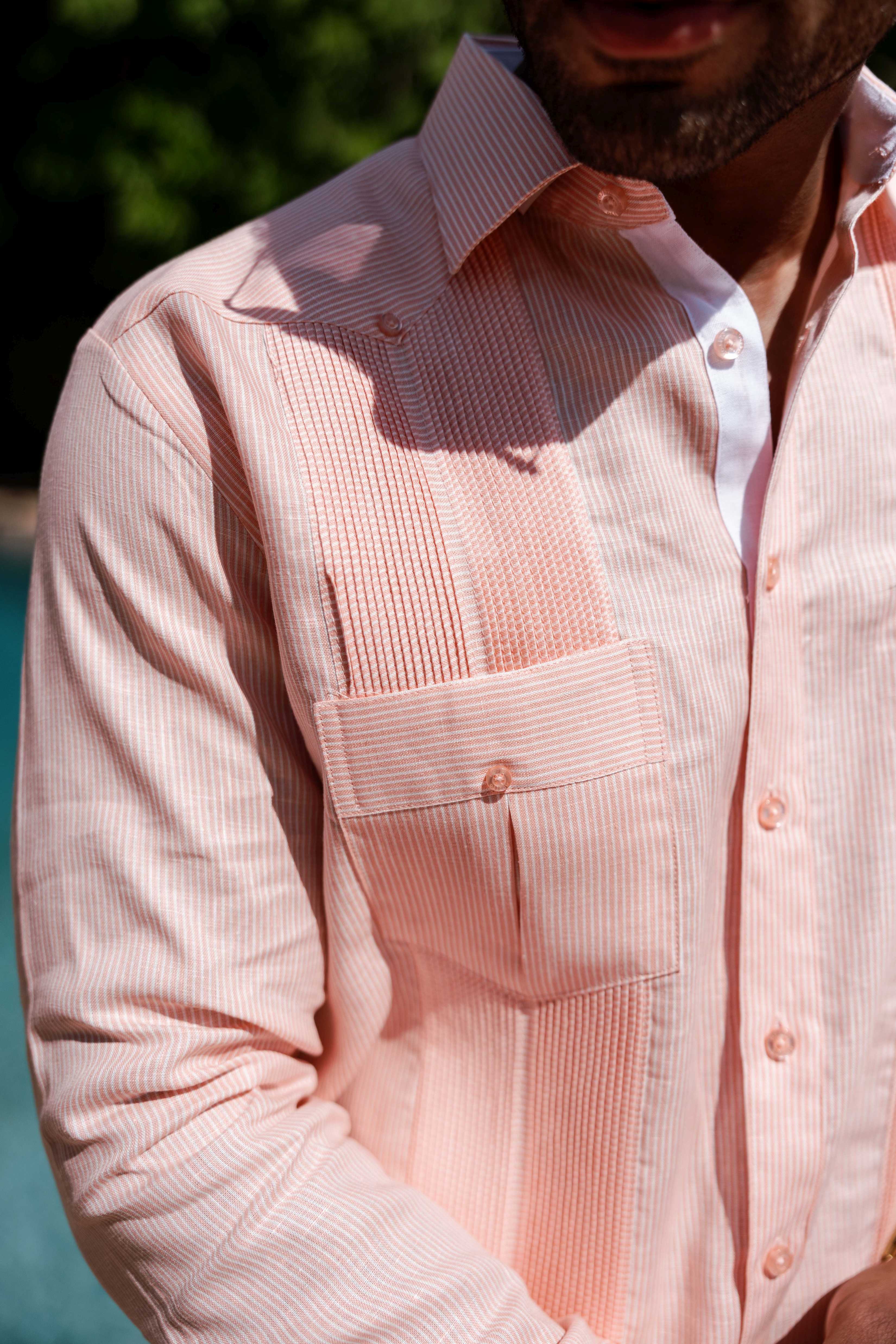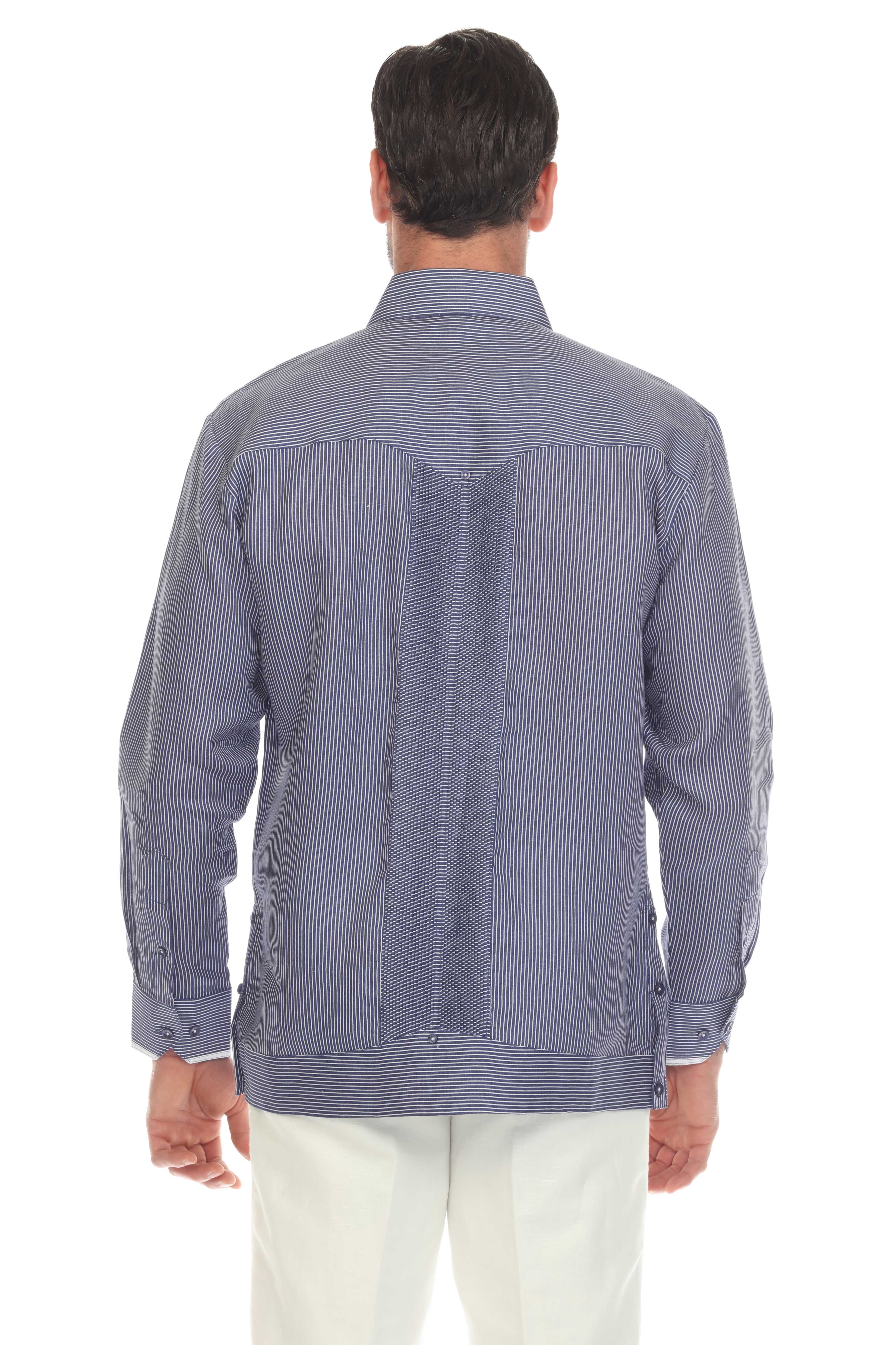 A signature best-seller from the Mojito Collection, this long sleeve guayabera combines timeless elegance with refined detailing. Crafted from 100% premium linen and finished with subtle pinstripe paneling and contrast trim at the pocket, it offers a crisp, elevated look for formal events, resort evenings, or everyday sophistication.