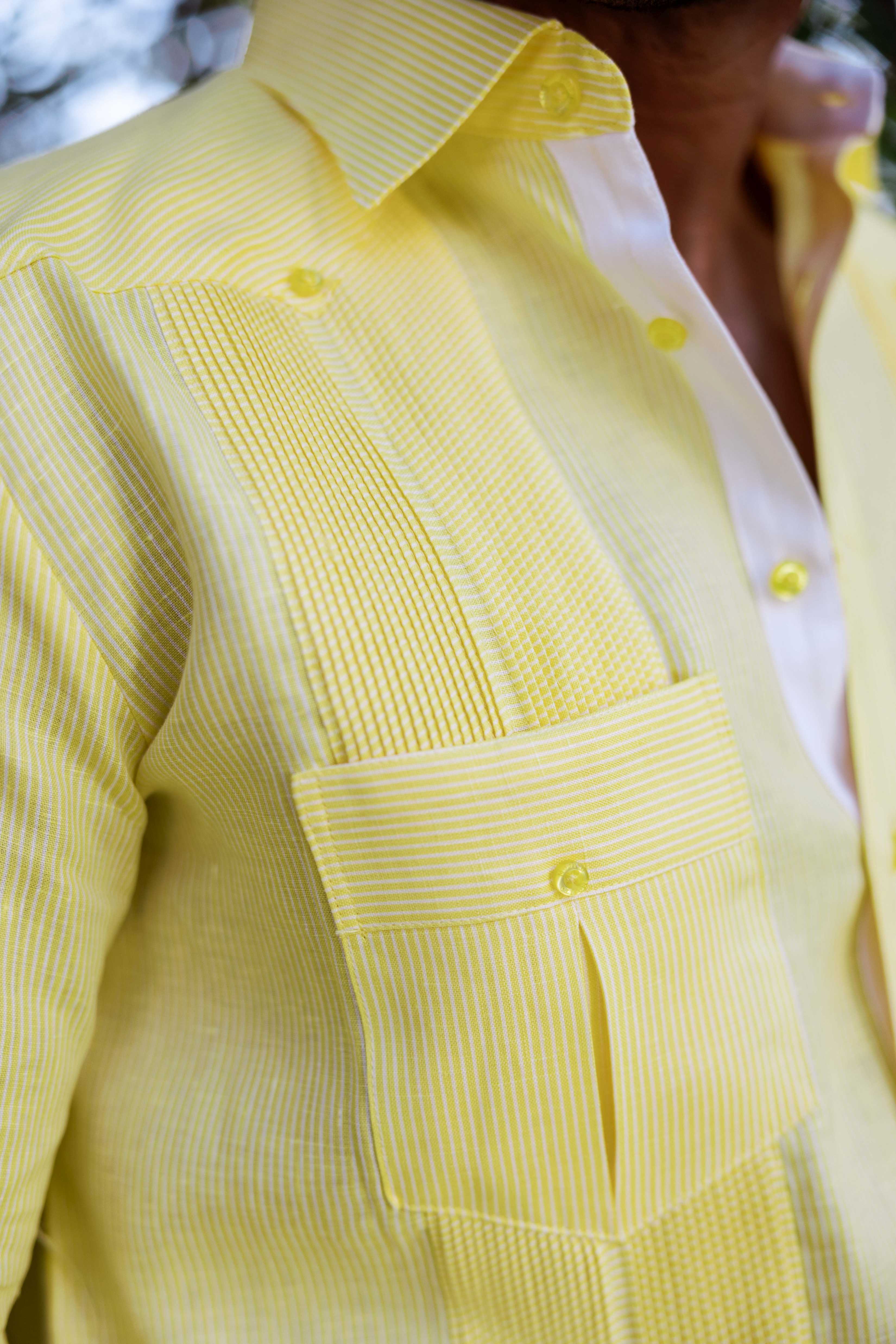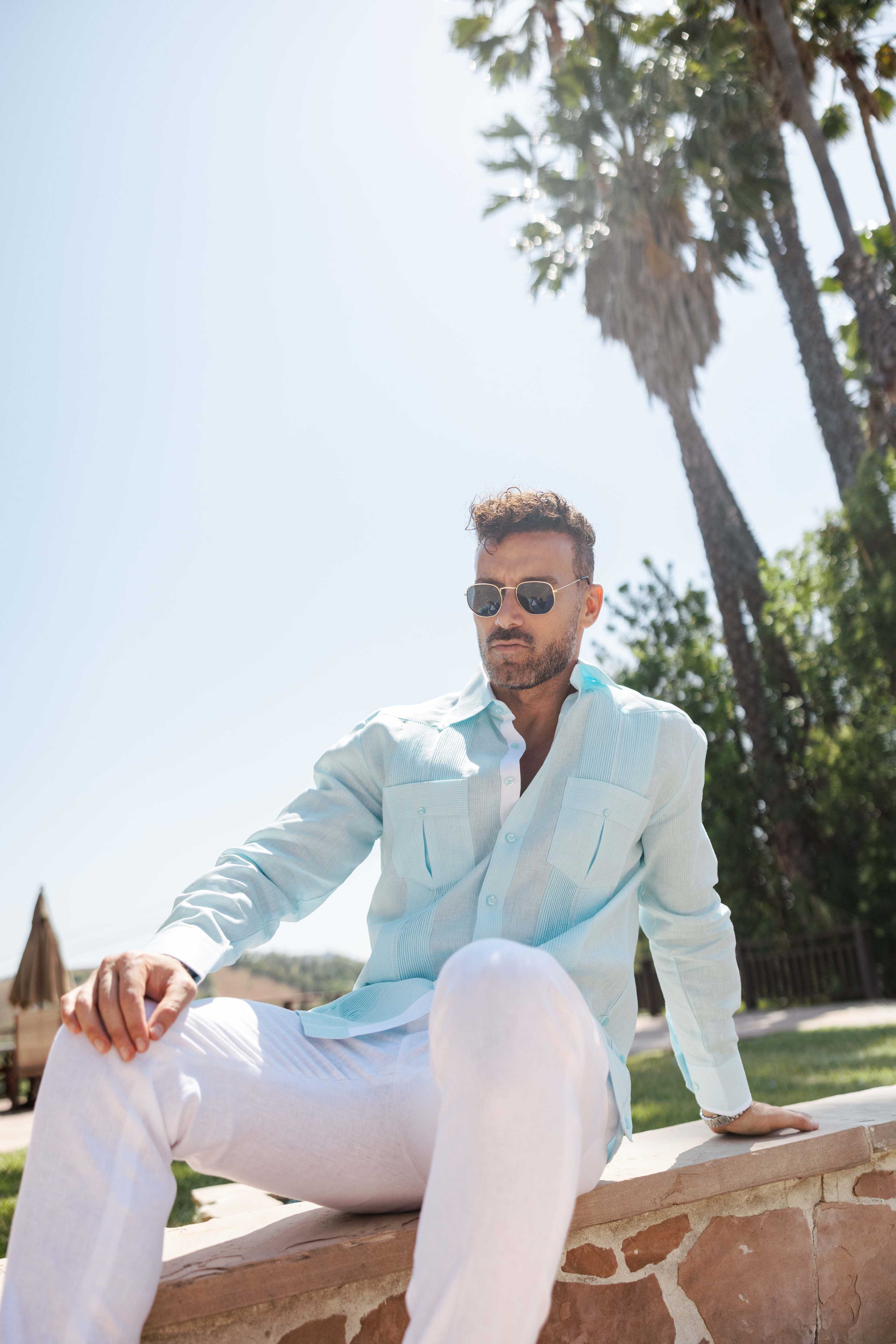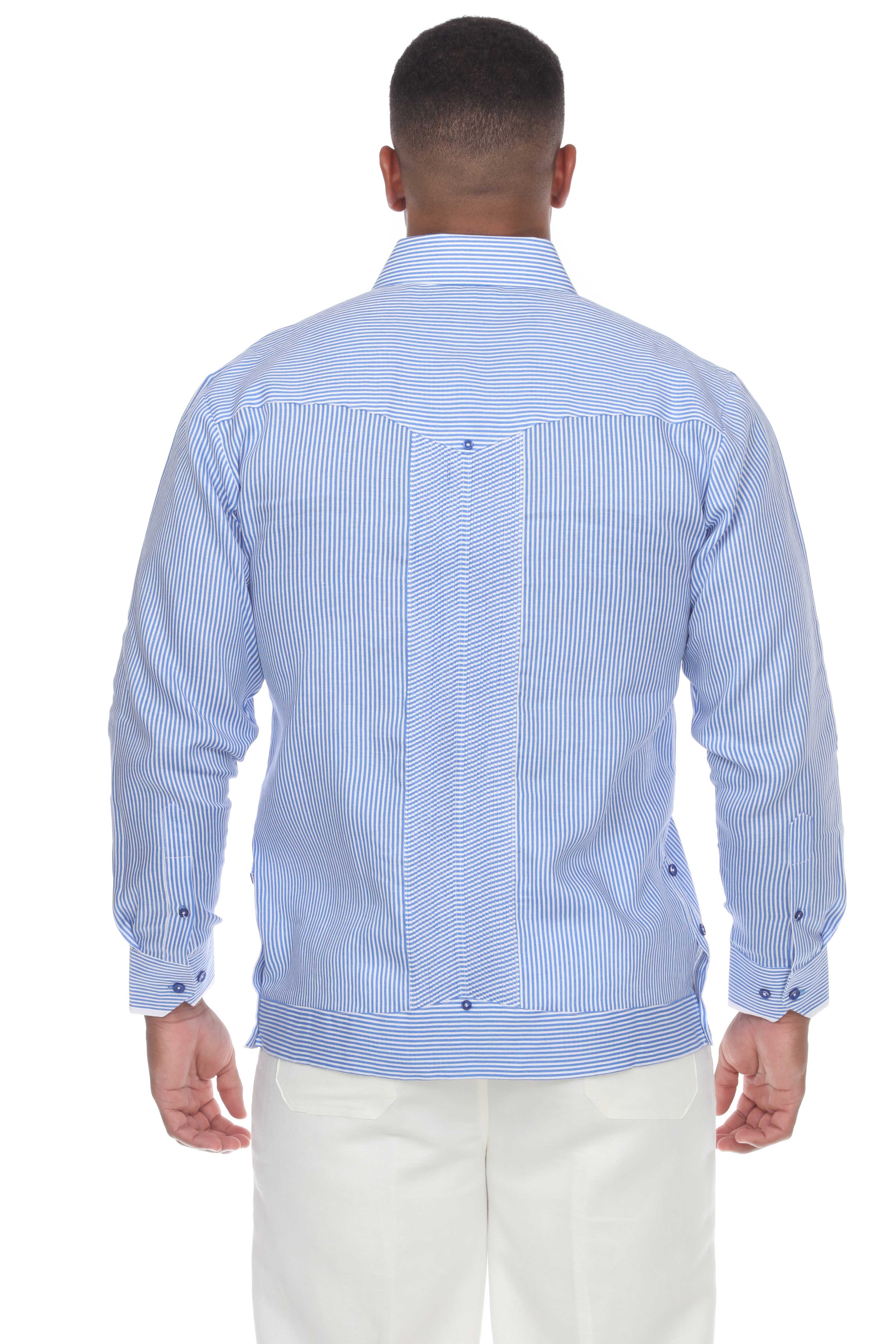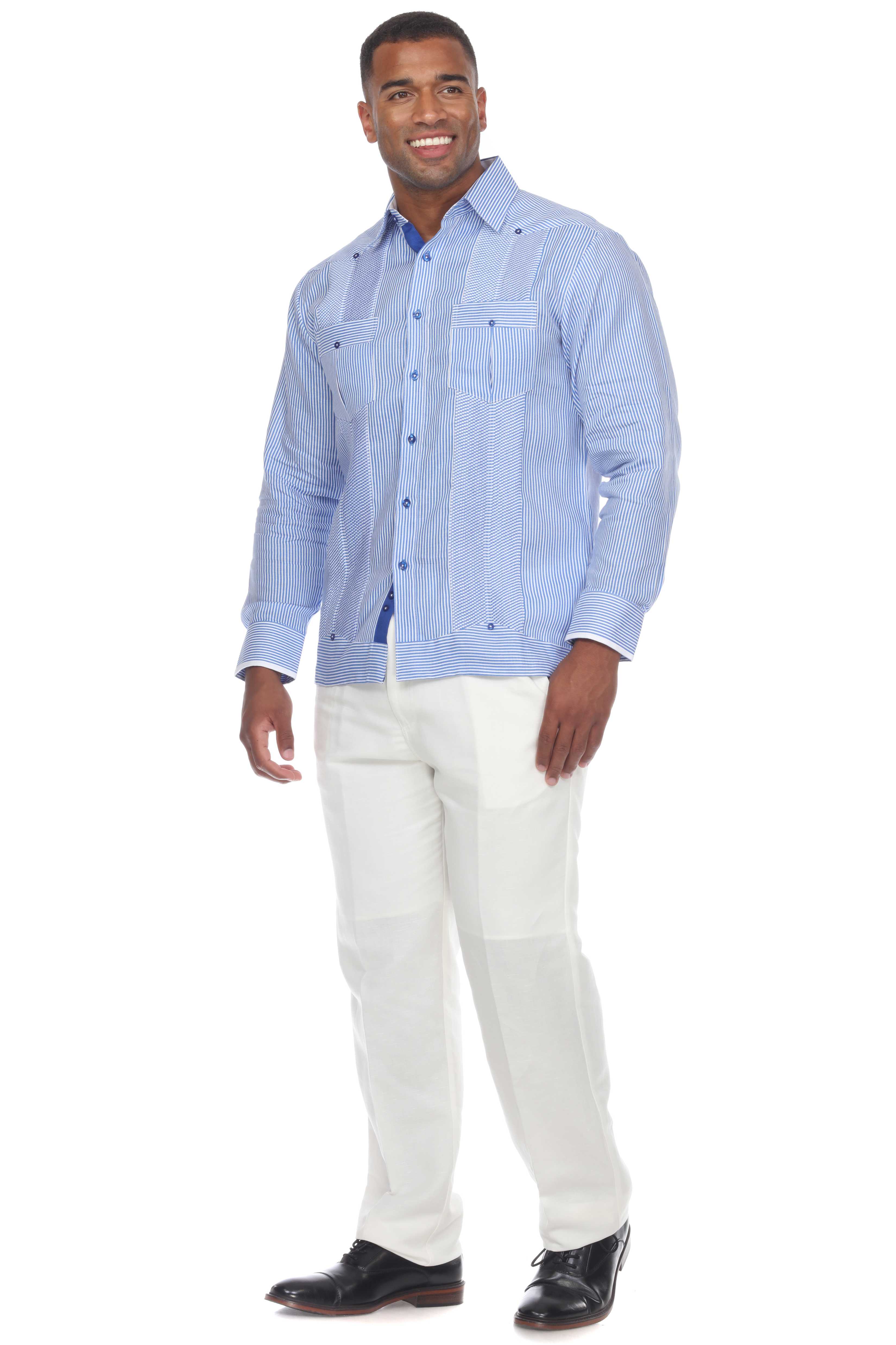 A signature best-seller from the Mojito Collection, this long sleeve guayabera combines timeless elegance with refined detailing. Crafted from 100% premium linen and finished with subtle pinstripe paneling and contrast trim at the pocket, it offers a crisp, elevated look for formal events, resort evenings, or everyday sophistication.