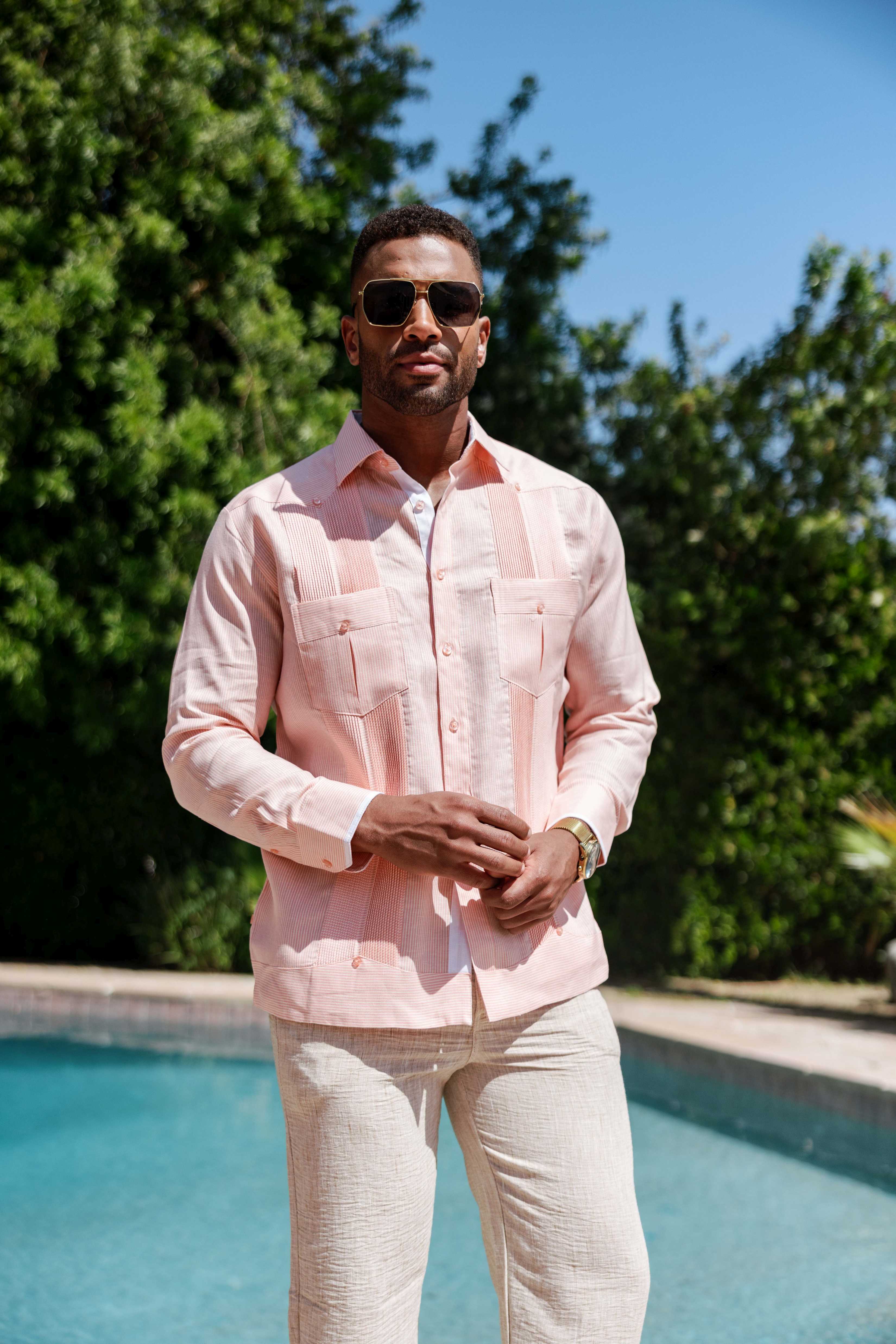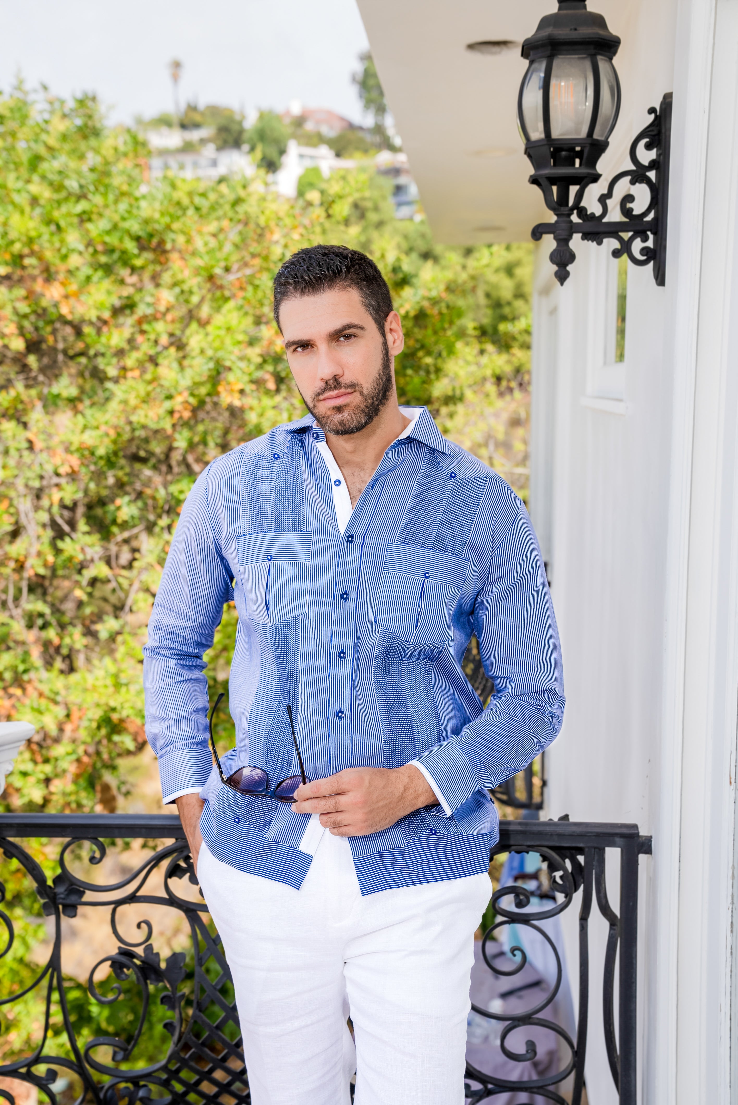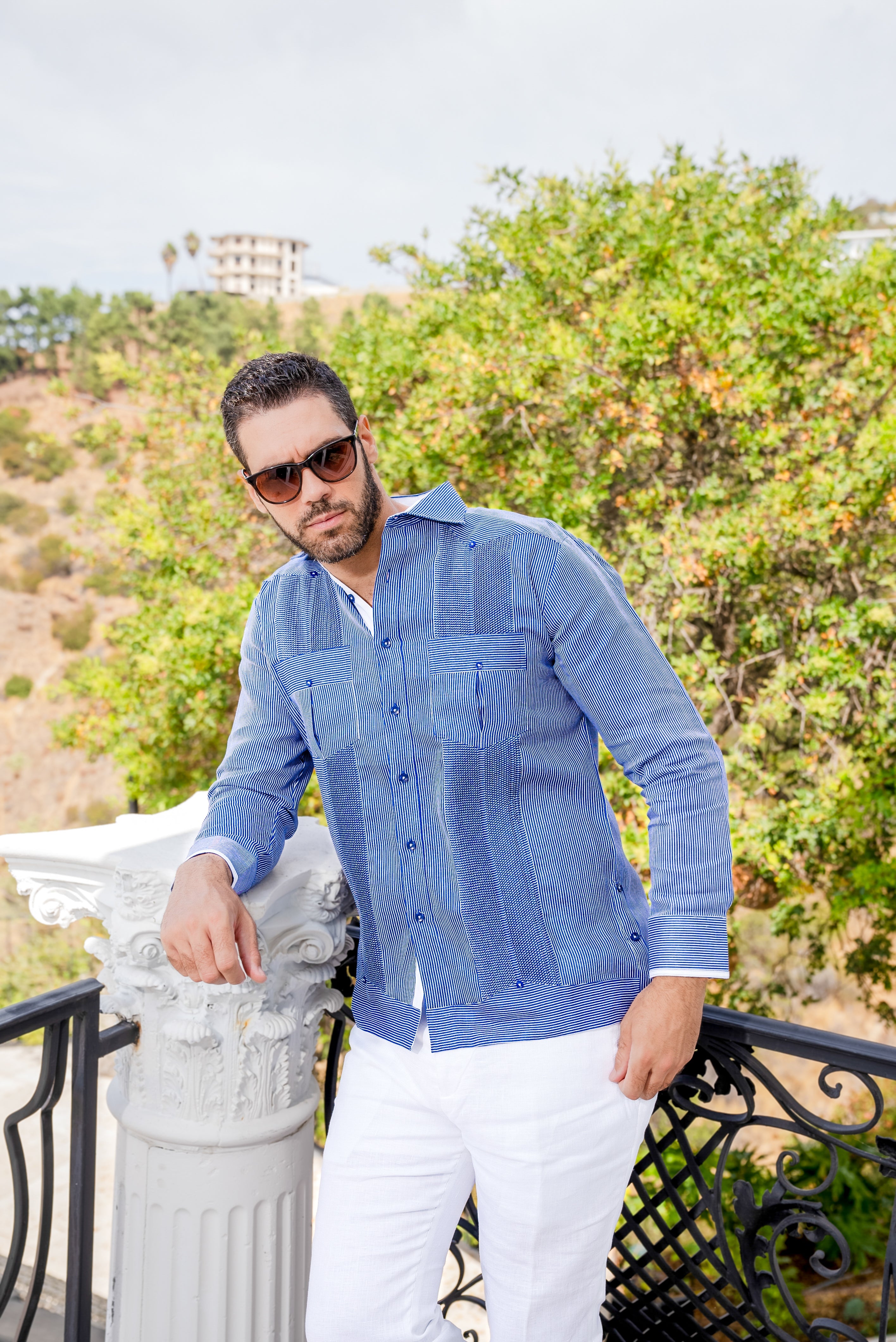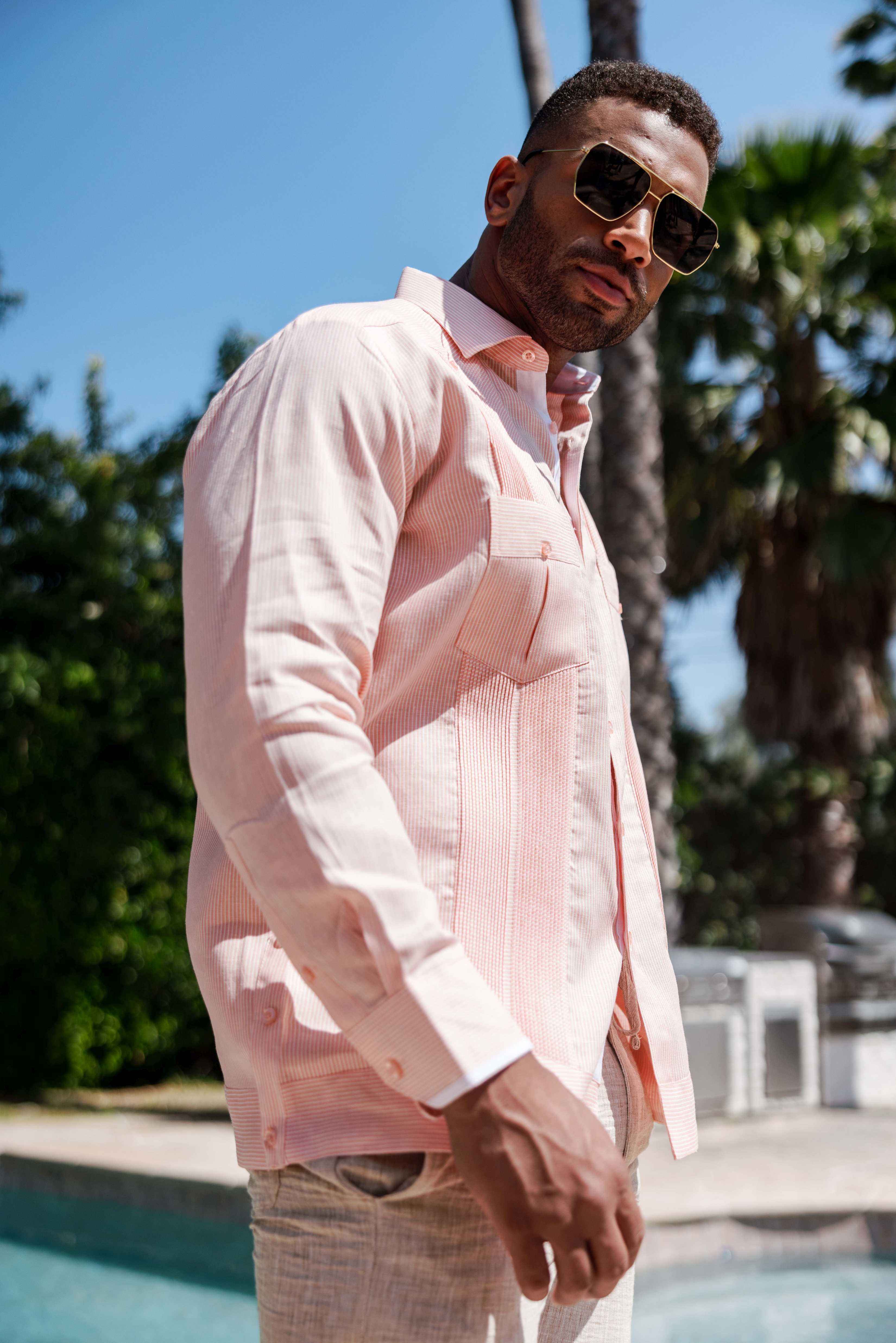 A signature best-seller from the Mojito Collection, this long sleeve guayabera combines timeless elegance with refined detailing. Crafted from 100% premium linen and finished with subtle pinstripe paneling and contrast trim at the pocket, it offers a crisp, elevated look for formal events, resort evenings, or everyday sophistication.