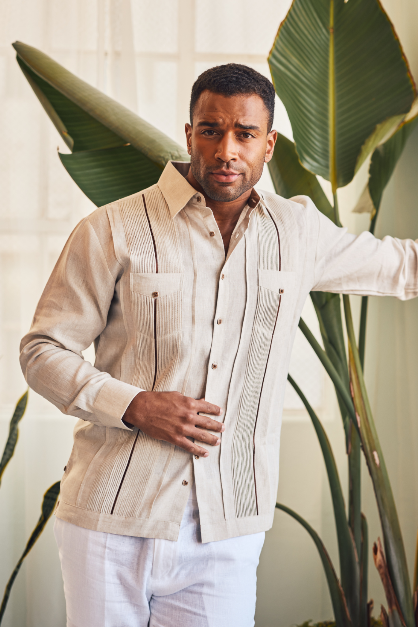 Discover timeless style with a modern twist in this Mojito long sleeve chacabana shirt, crafted from 100% breathable linen and finished with sophisticated contrast trim detailing. A fresh take on the traditional guayabera, this piece blends refined structure with island-inspired ease—ideal for weddings, parties, and warm-weather elegance.