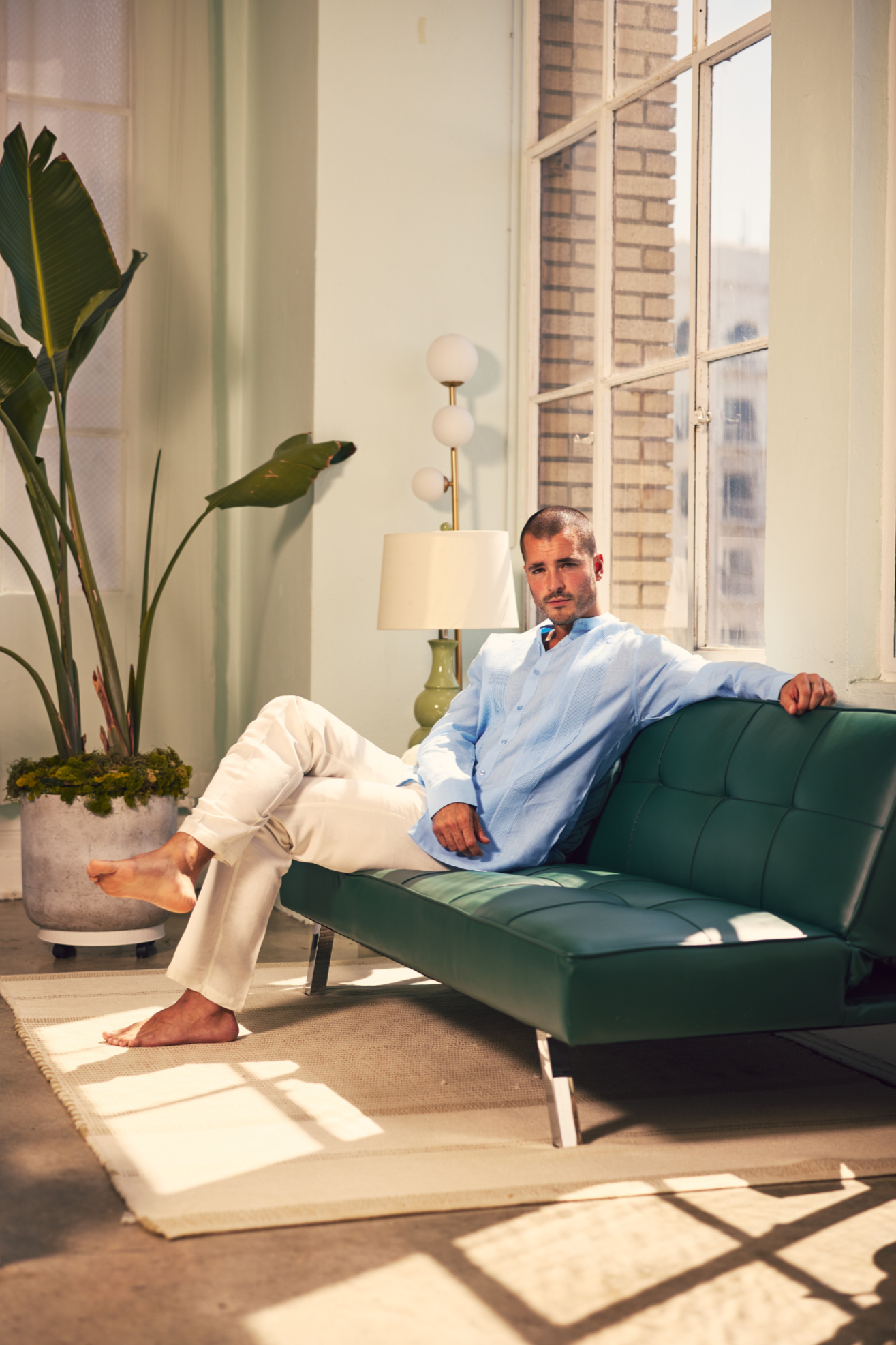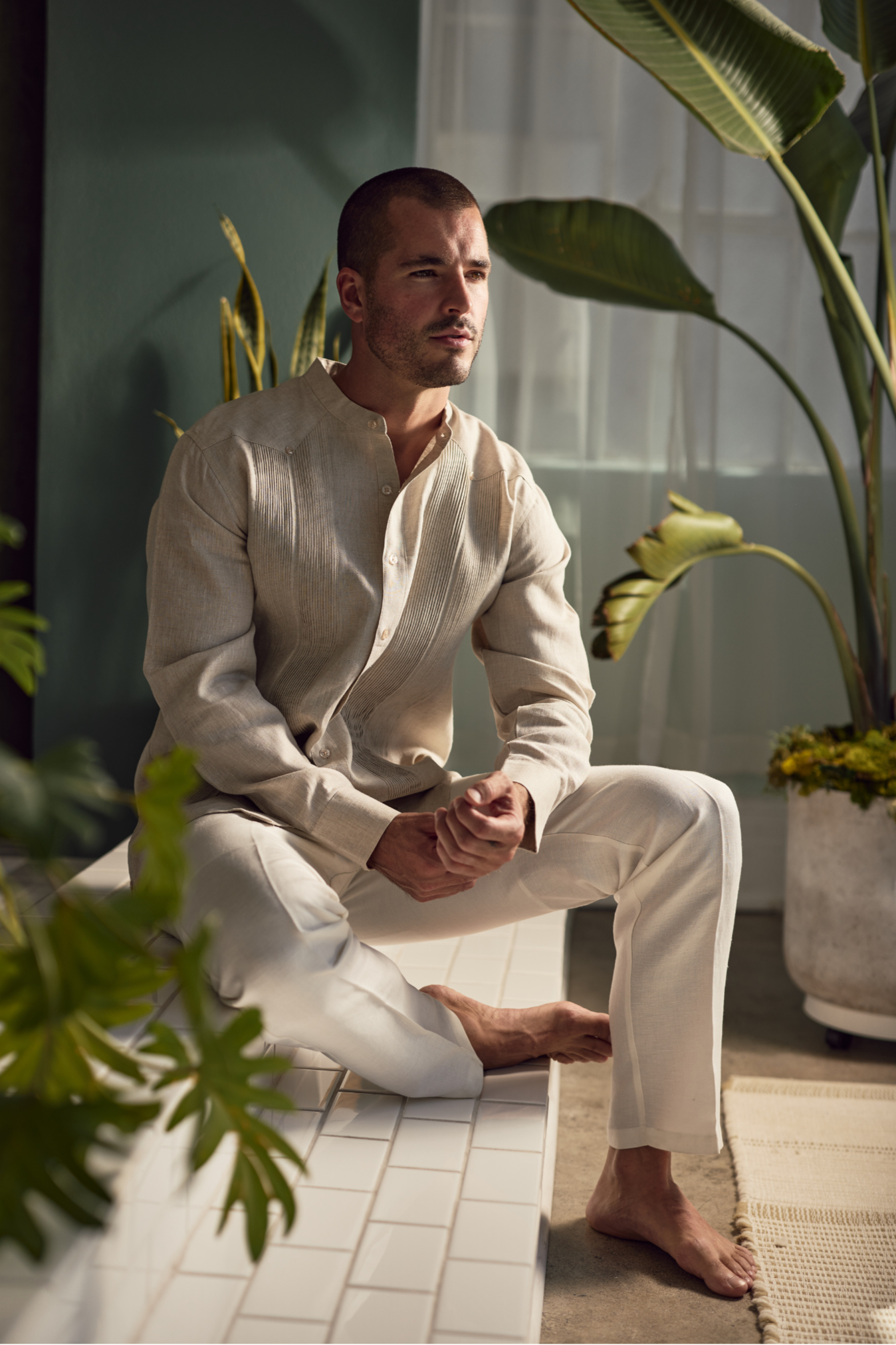 A Mojito Collection standout, this 100% linen long-sleeve guayabera features a modern mandarin collar and refined pleated detailing, blending sophisticated wedding style with timeless Latin tradition. Designed for resort weddings, beach celebrations, and elegant gatherings, it offers a crisp, lightweight feel perfect for warm-weather elegance.