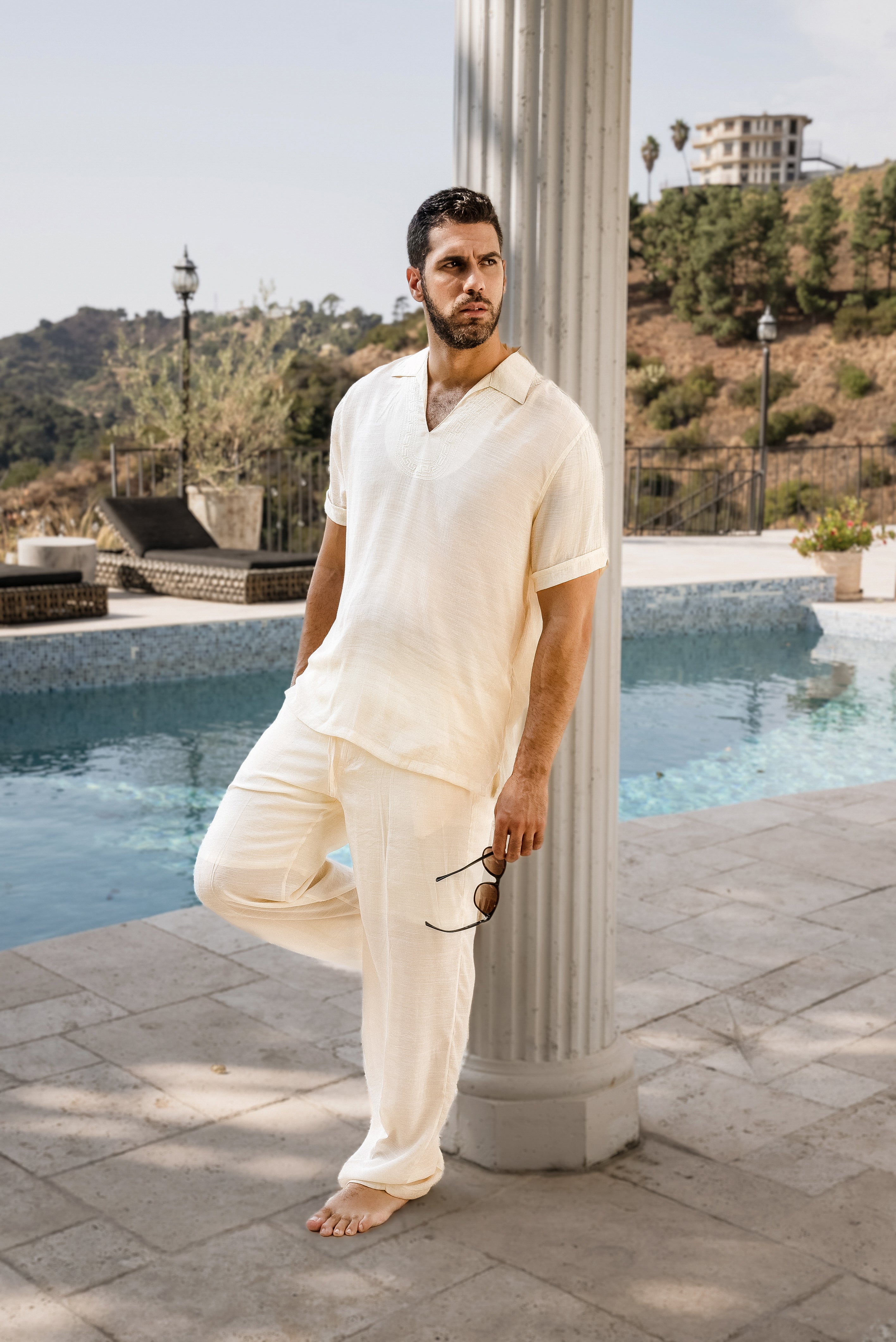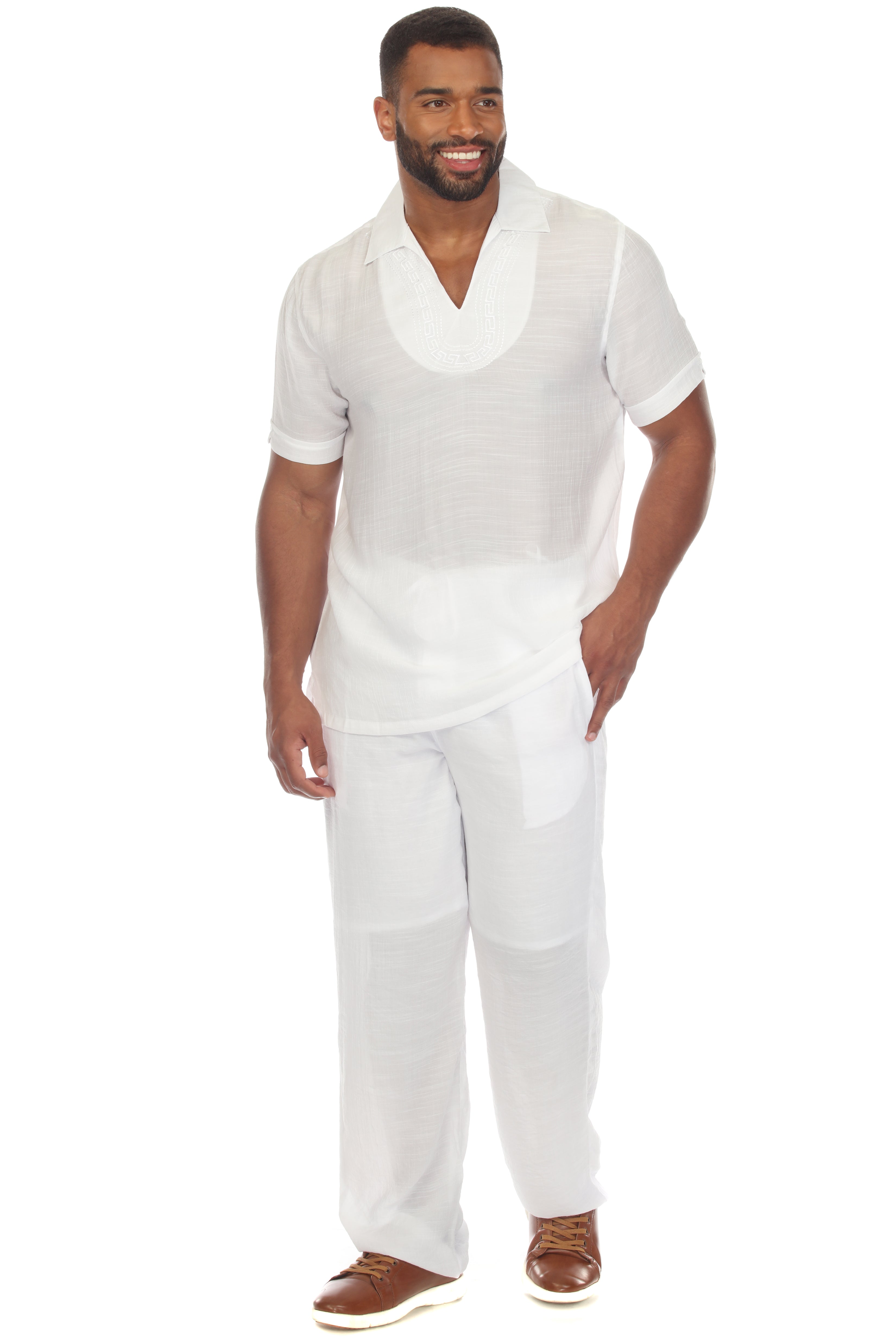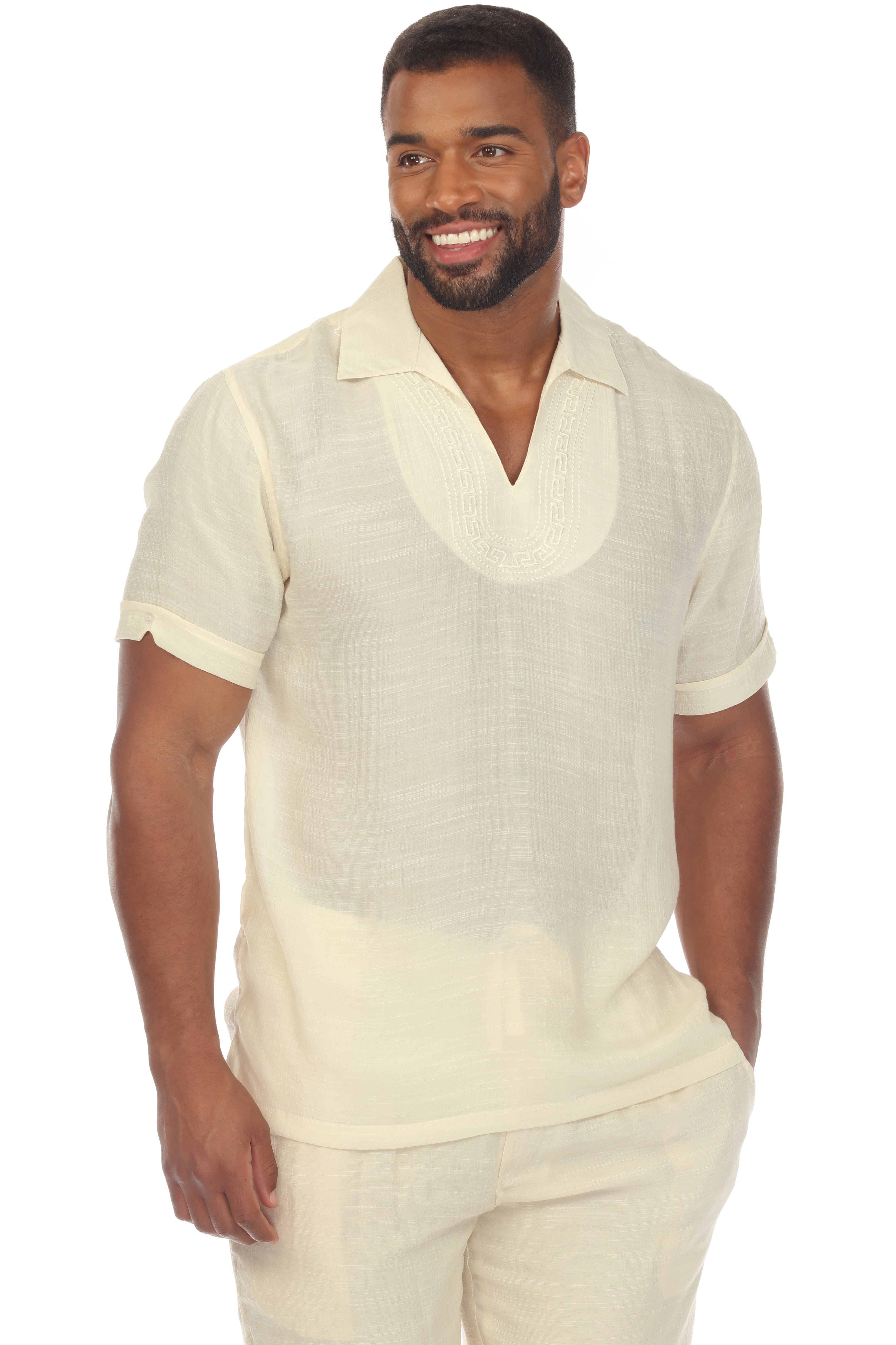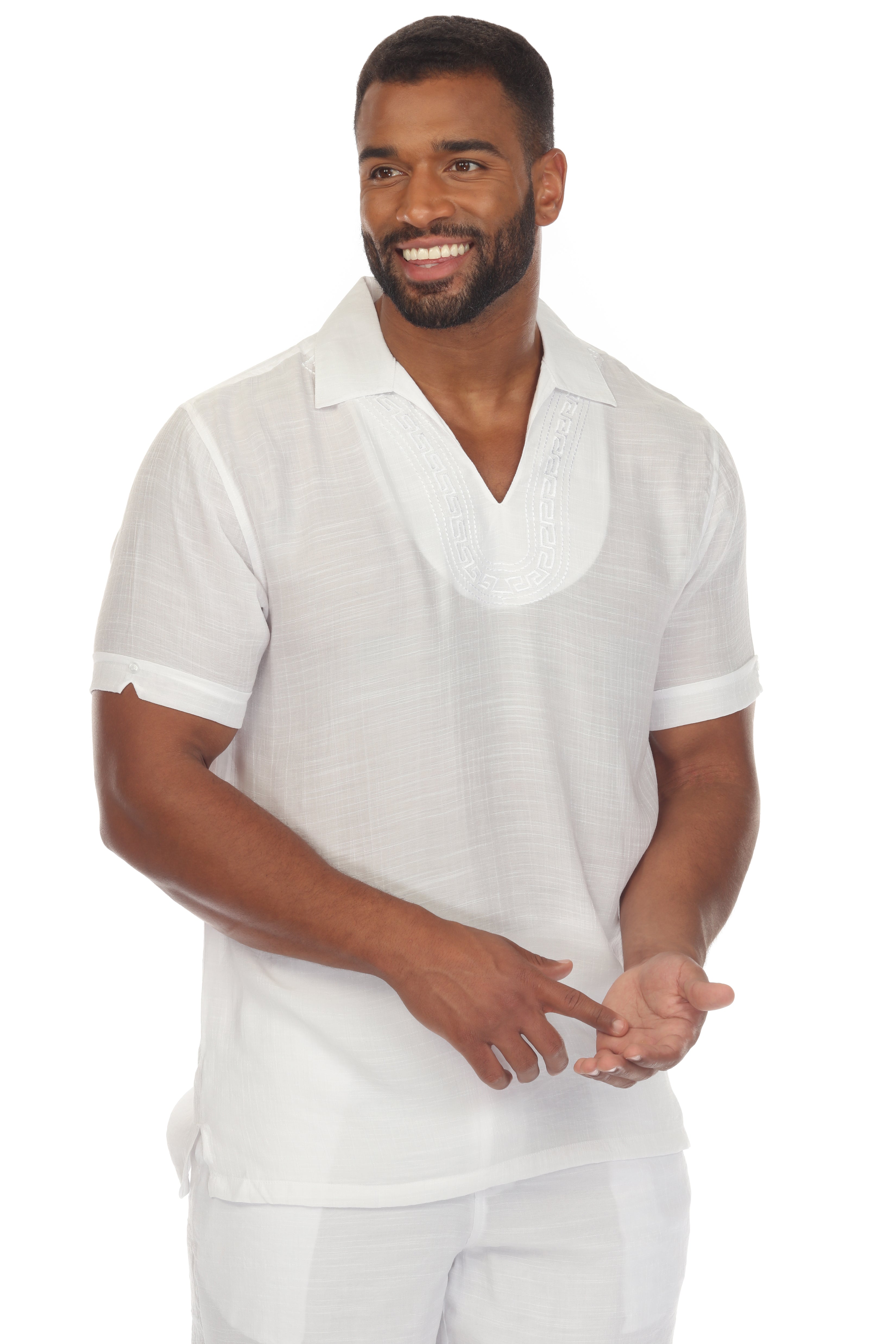 Men's Beach V-Neck Collar Shirt Short Sleeve with Embroidered Accent