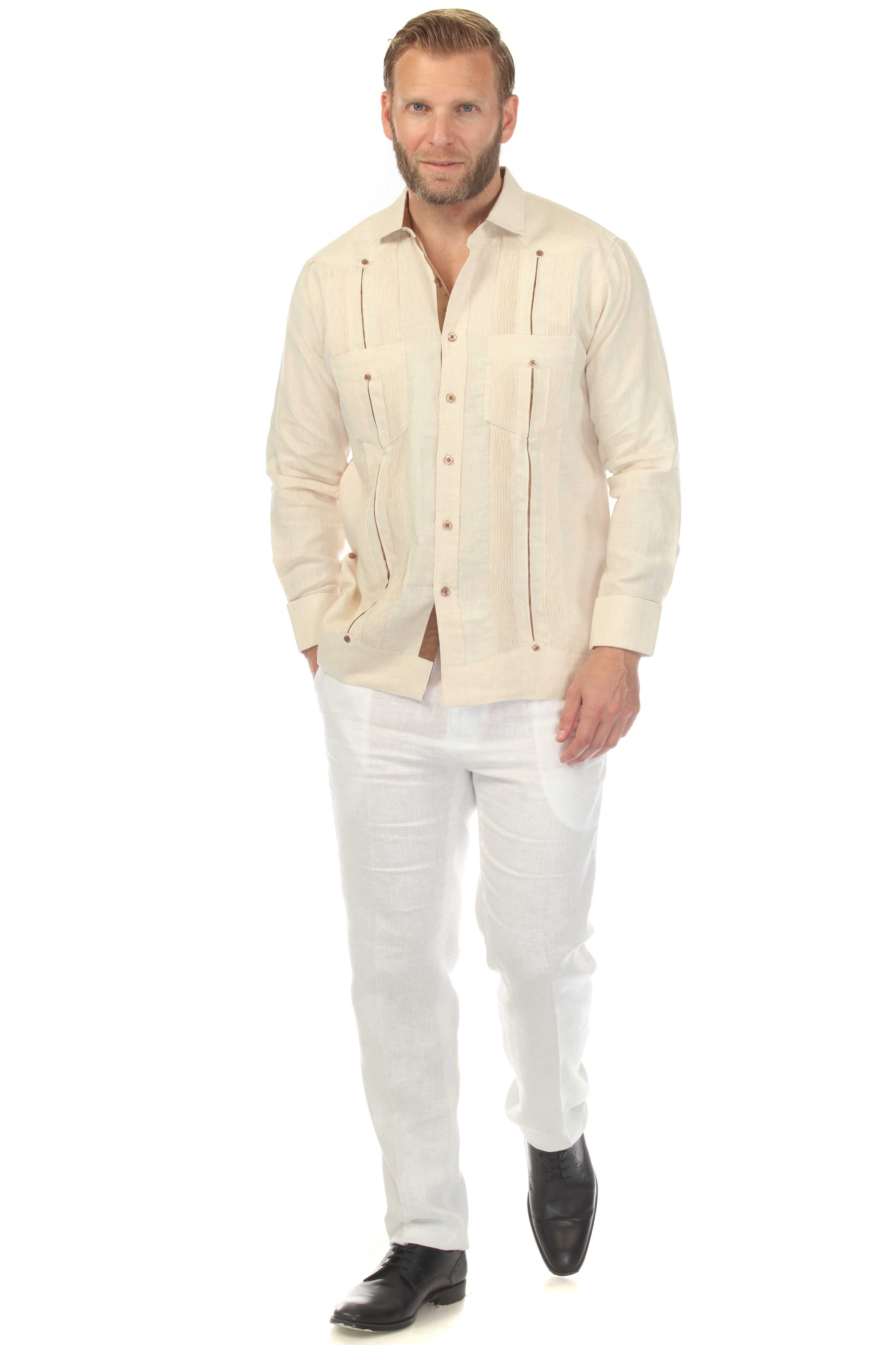 Vibrant and refined, this long-sleeve Men’s Guayamisa is crafted from 100% breathable linen and elevated with contrast satin taping and handcrafted detailing throughout. Featuring handcrafted chest pockets, a traditional pleated front, and French cuffs, this piece blends heritage Latin craftsmanship with modern sophistication — ideal for weddings, formal events, and elevated evenings out.