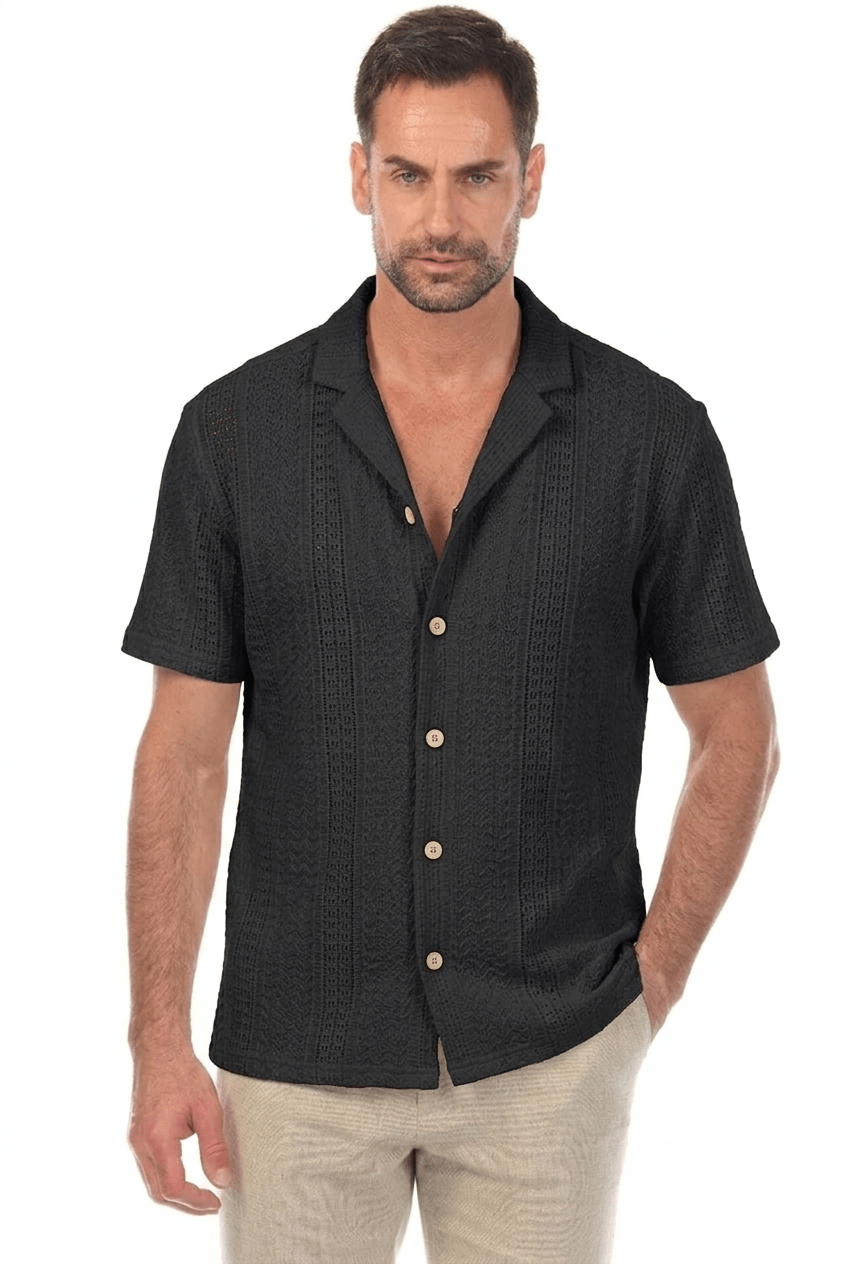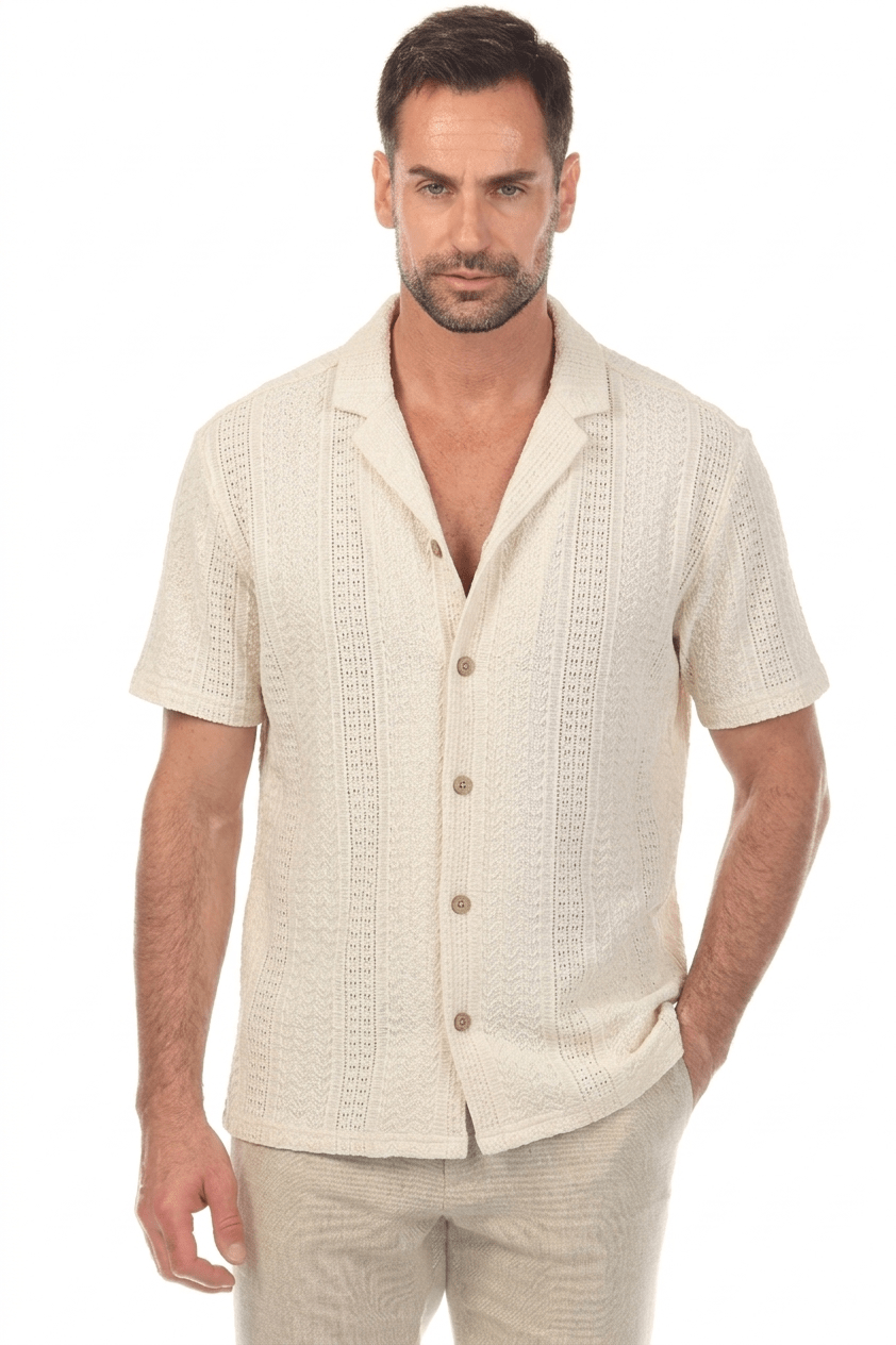 Designed for effortless comfort and elevated casual style, this textured button-down knit shirt features a refined cable-knit pattern with natural stretch for ease of movement. Soft, lightweight, and versatile, it pairs seamlessly with jeans or chinos for a polished yet relaxed look.