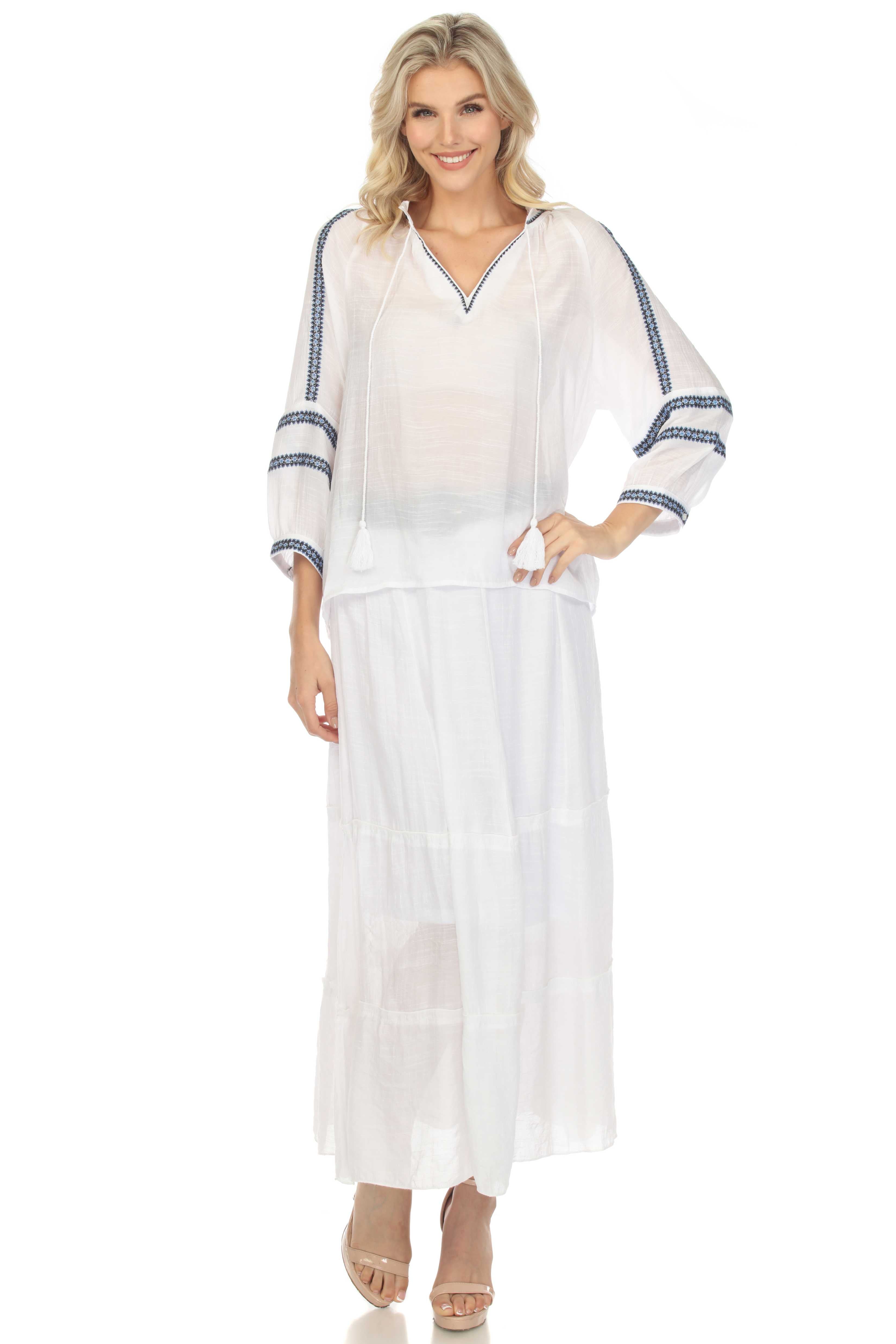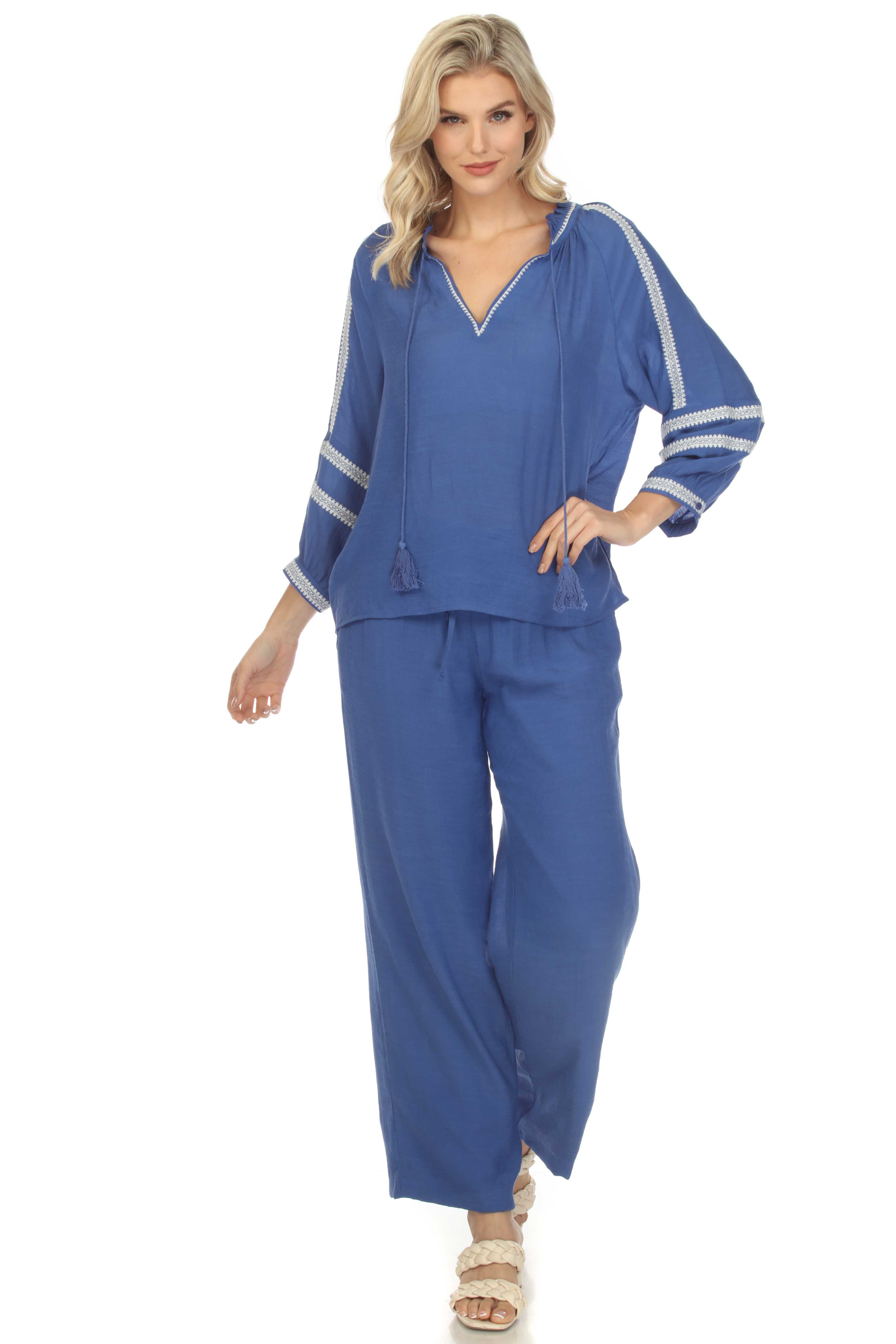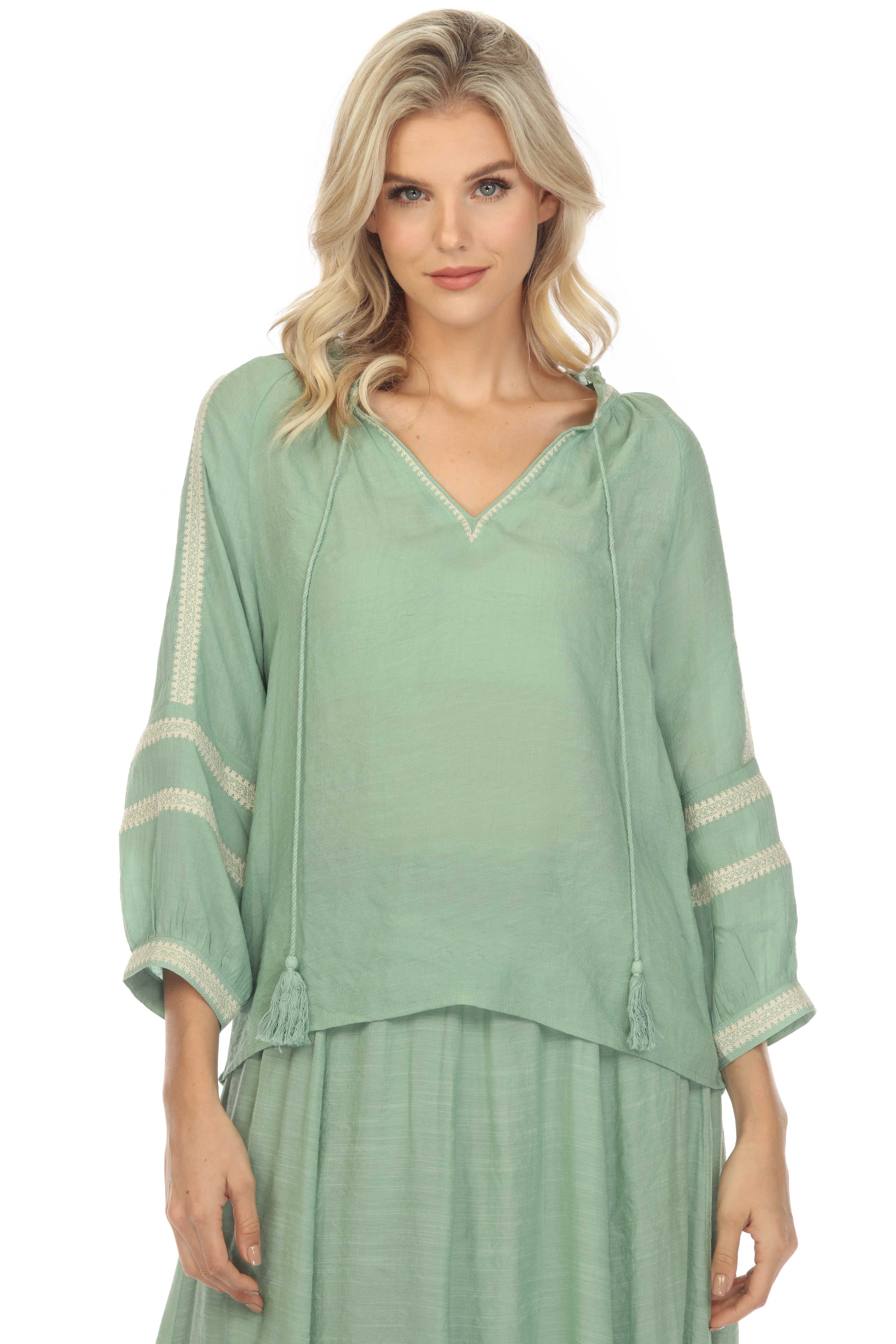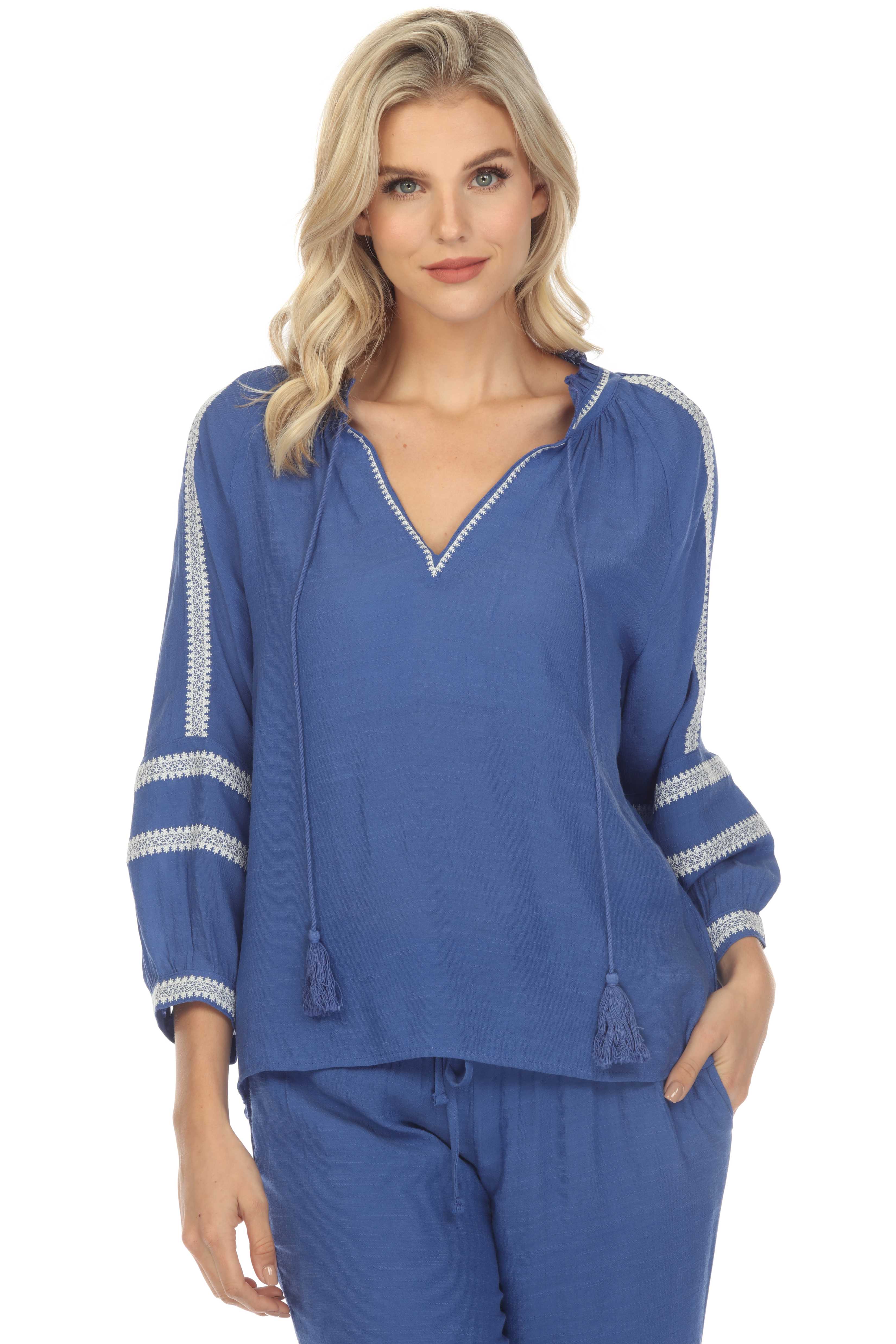 Women's Casual Resort Wear V-Neck Crochet Trimmed ¾ Sleeve Tunic Top with Tassel Drawstrings