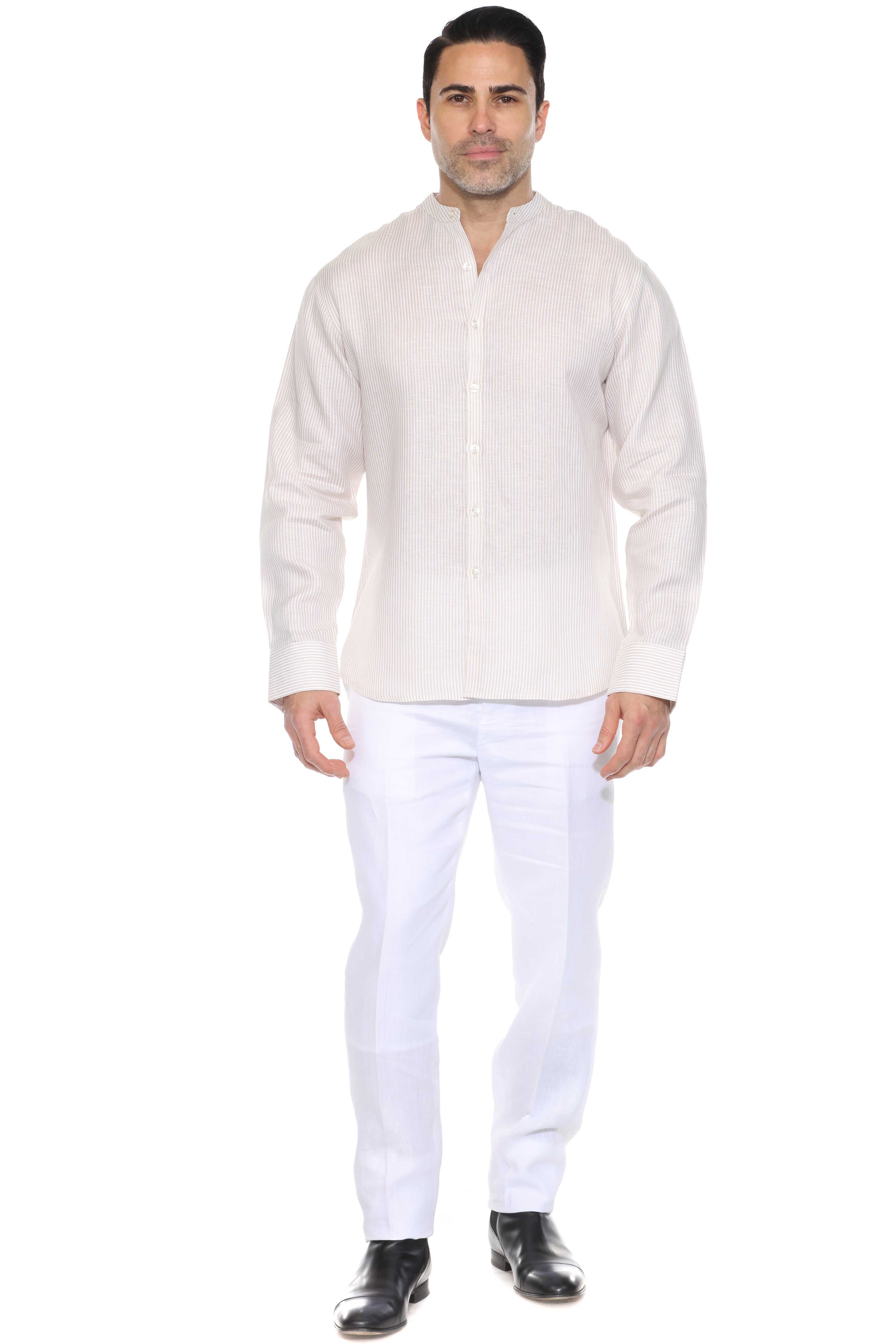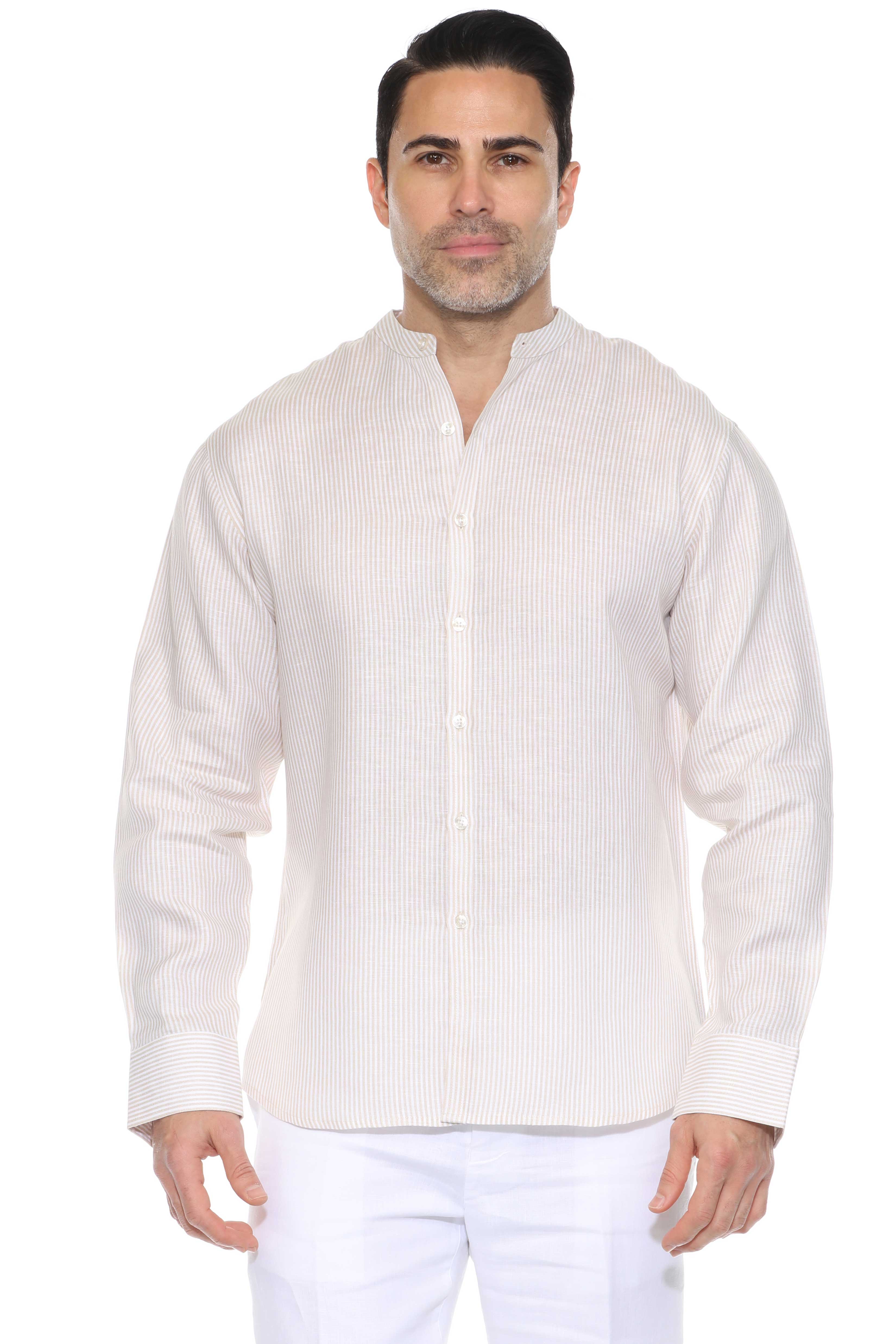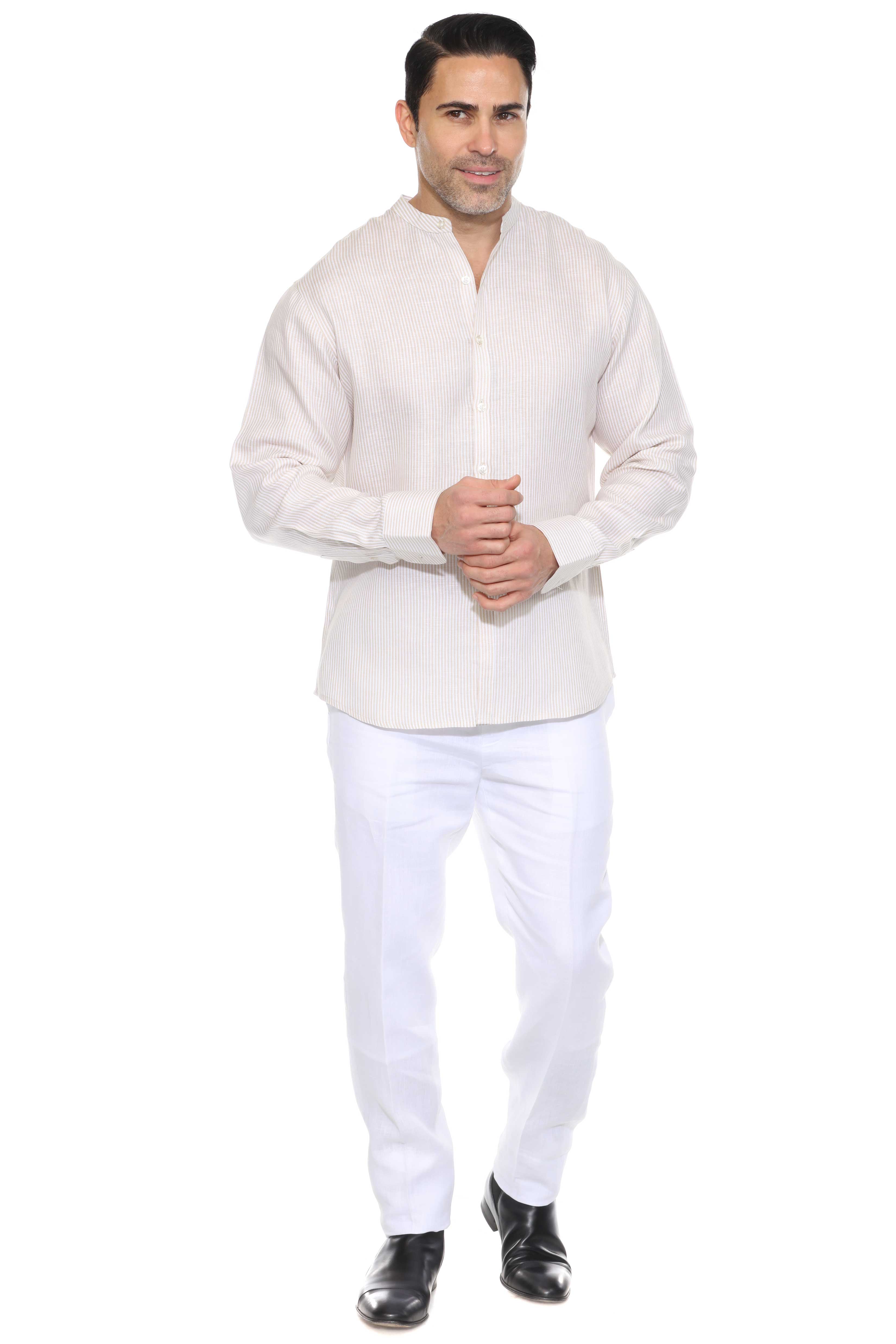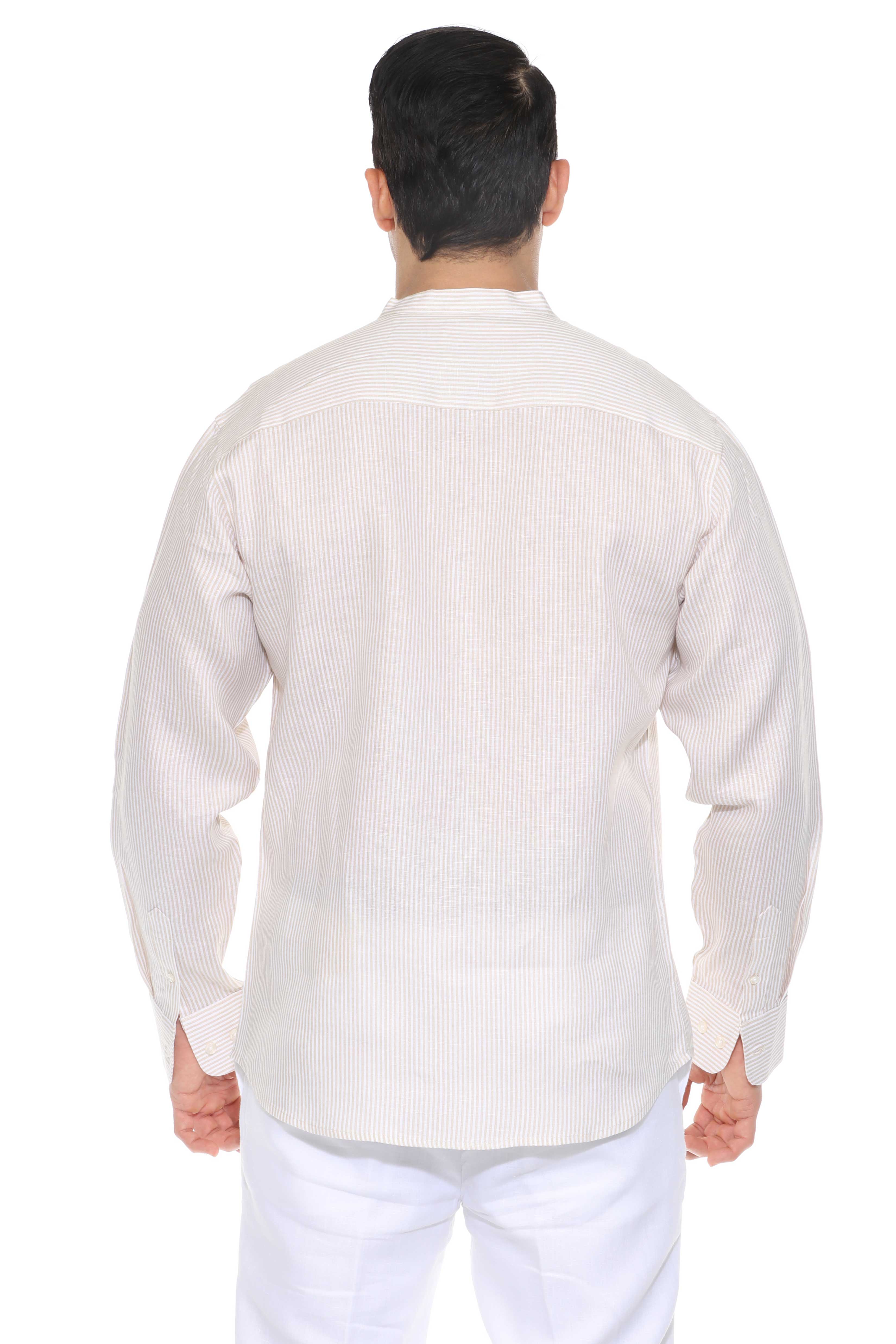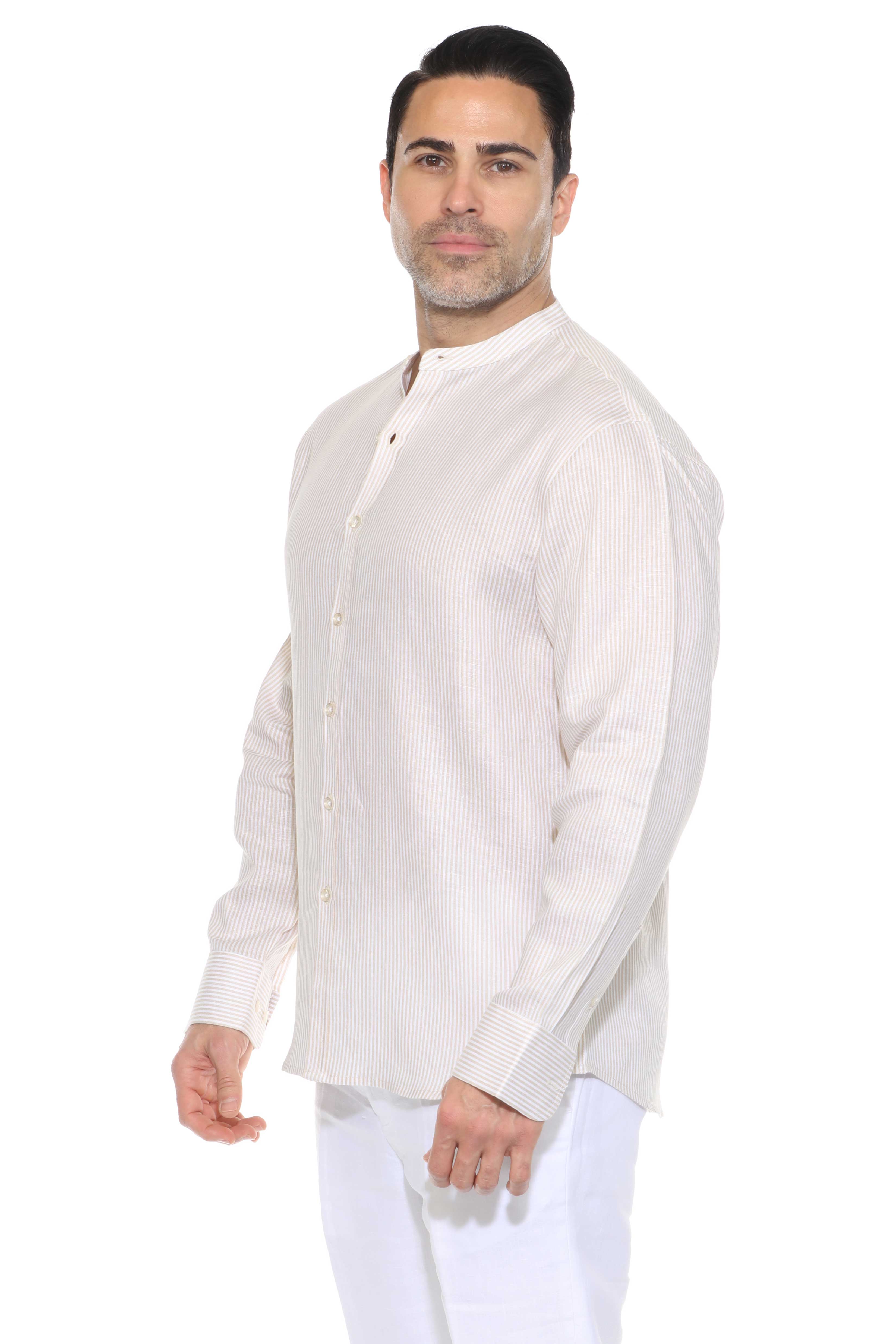 Minimalist elegance meets breathable luxury in this long-sleeved mandarin collar shirt, crafted from 100% premium linen. Designed with refined pinstripes and a clean collarless neckline, it’s the ideal warm-weather piece for relaxed sophistication—perfect for tropical getaways, casual weddings, or elevated daywear.