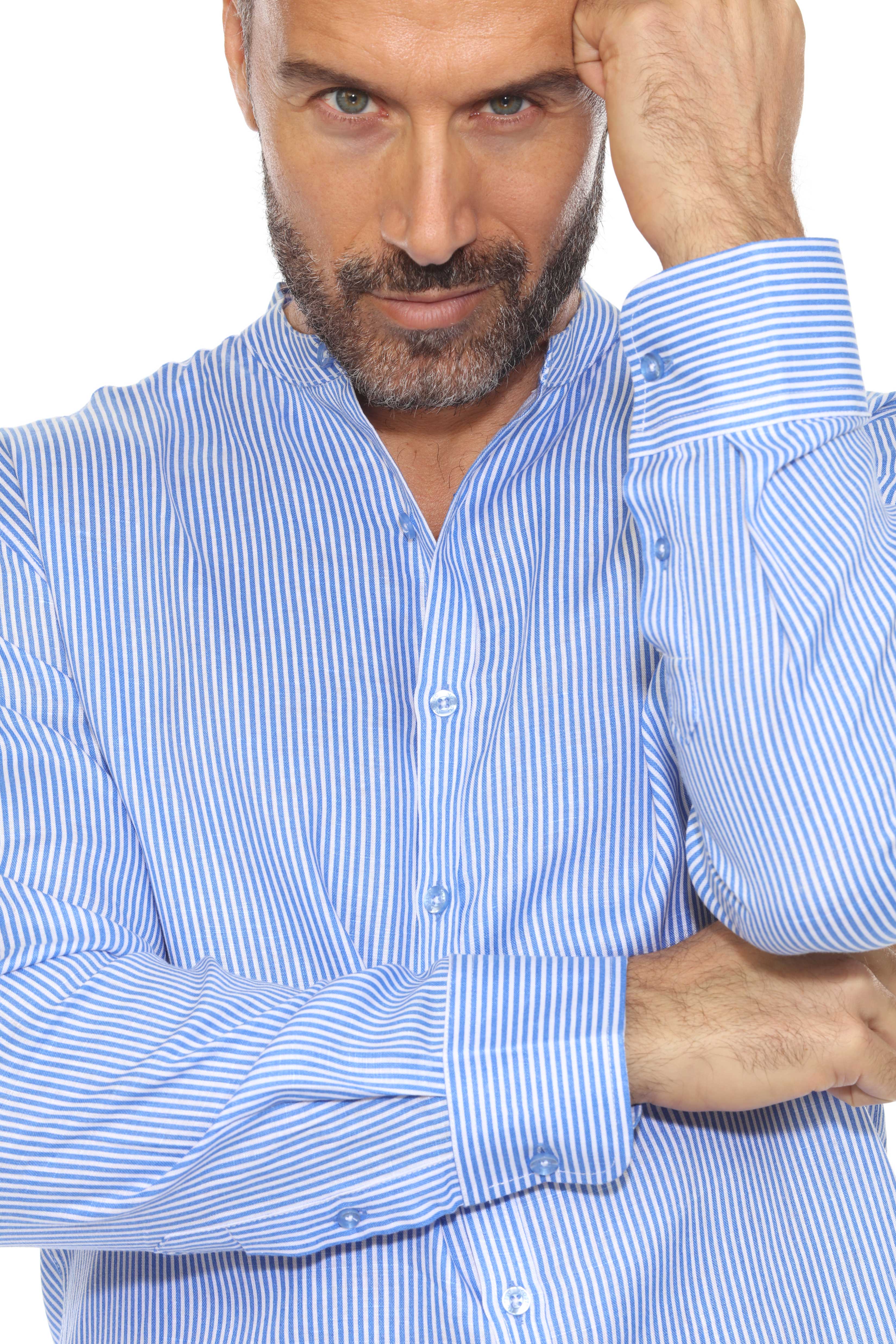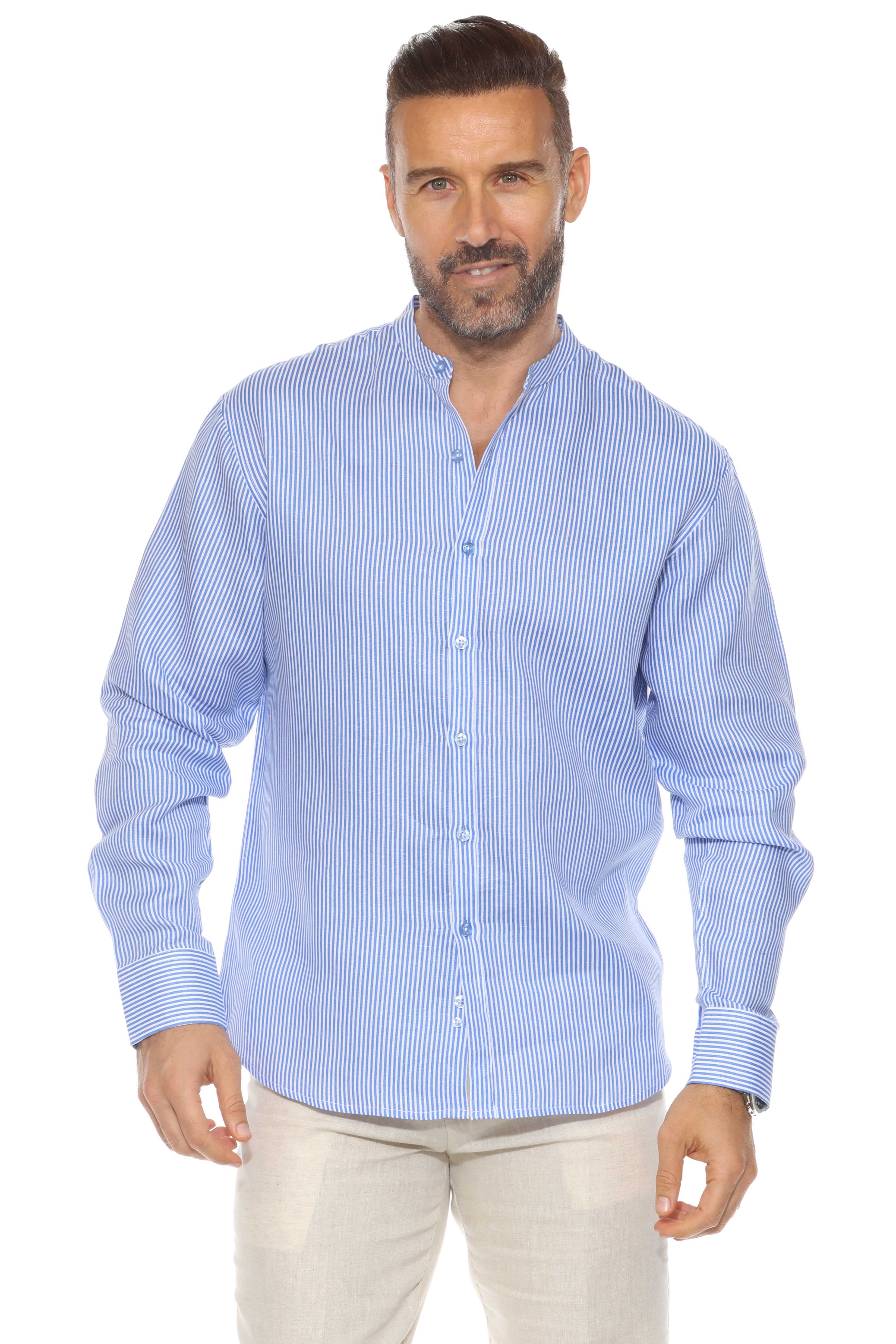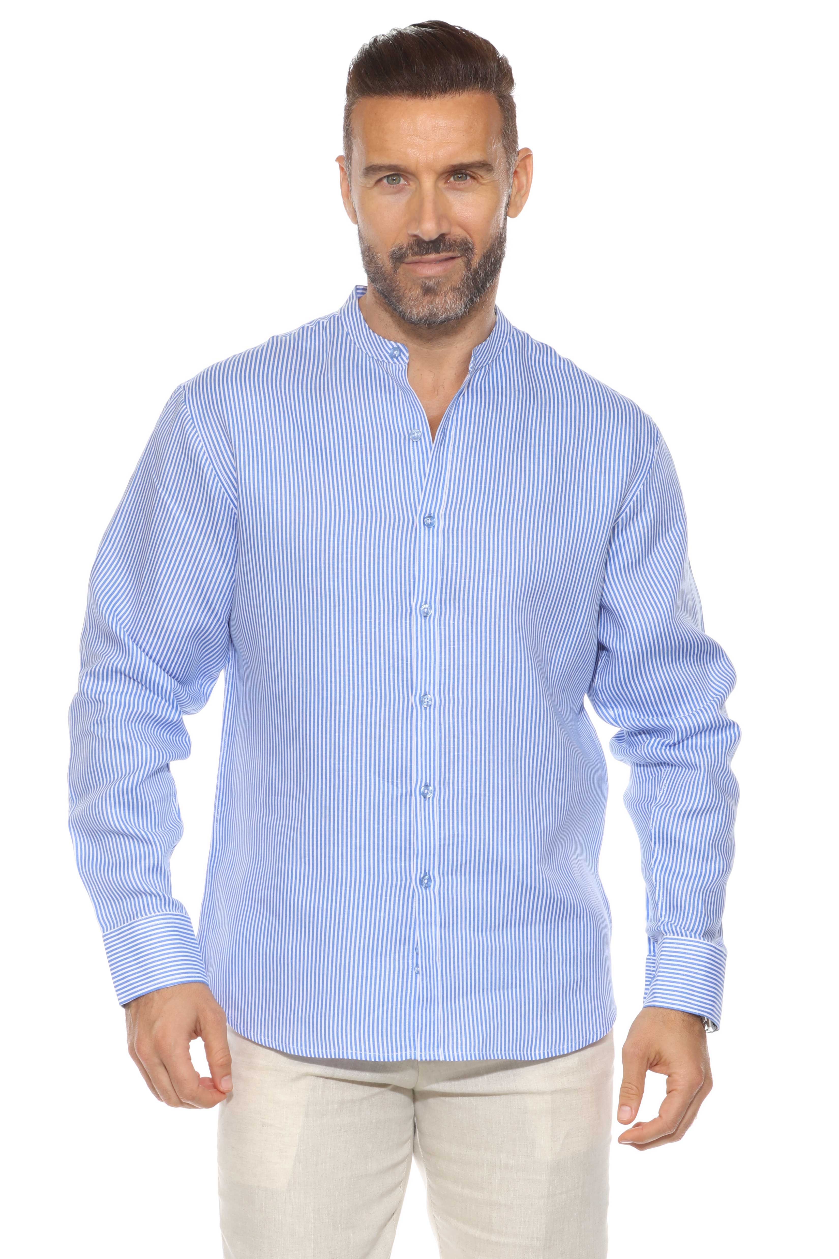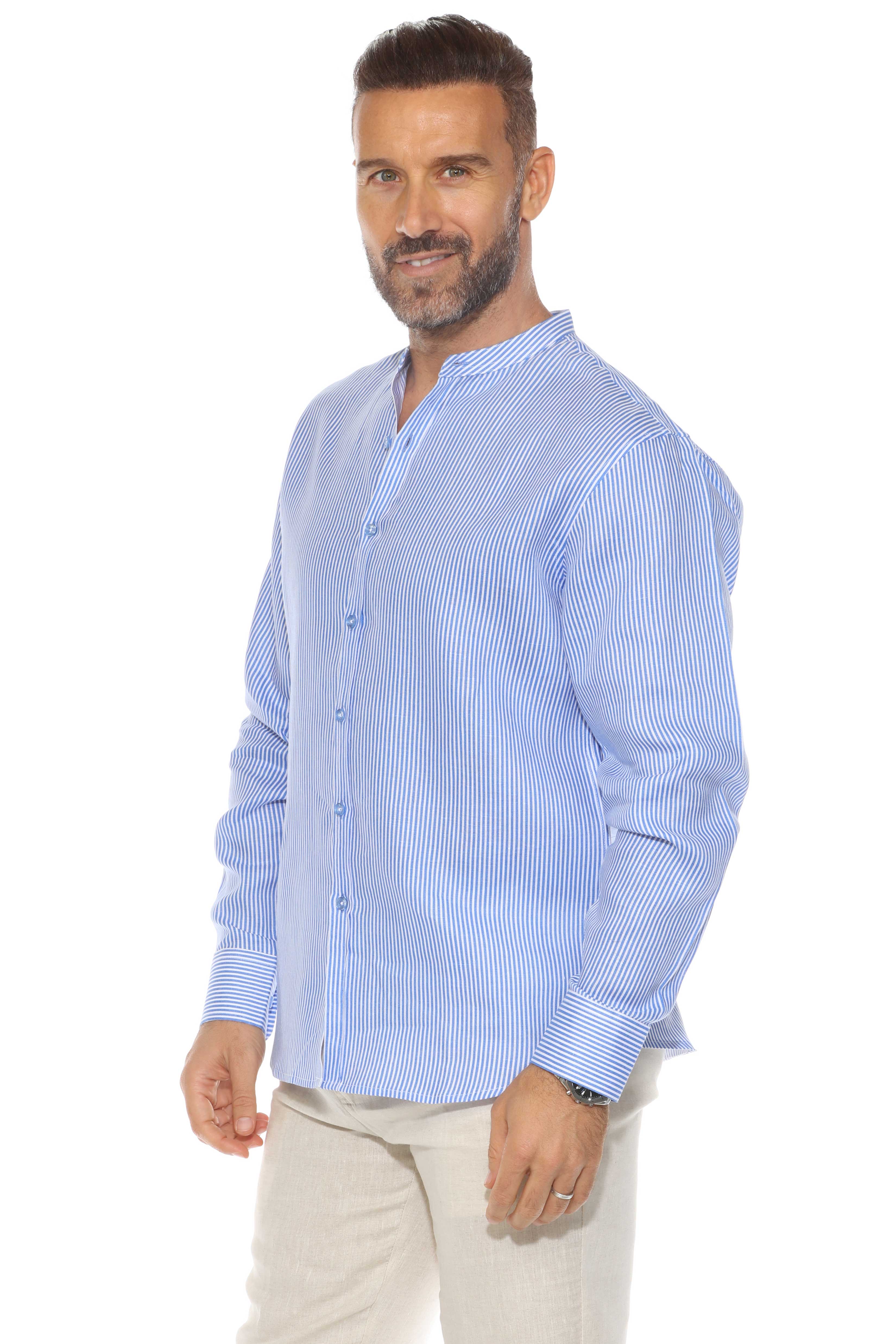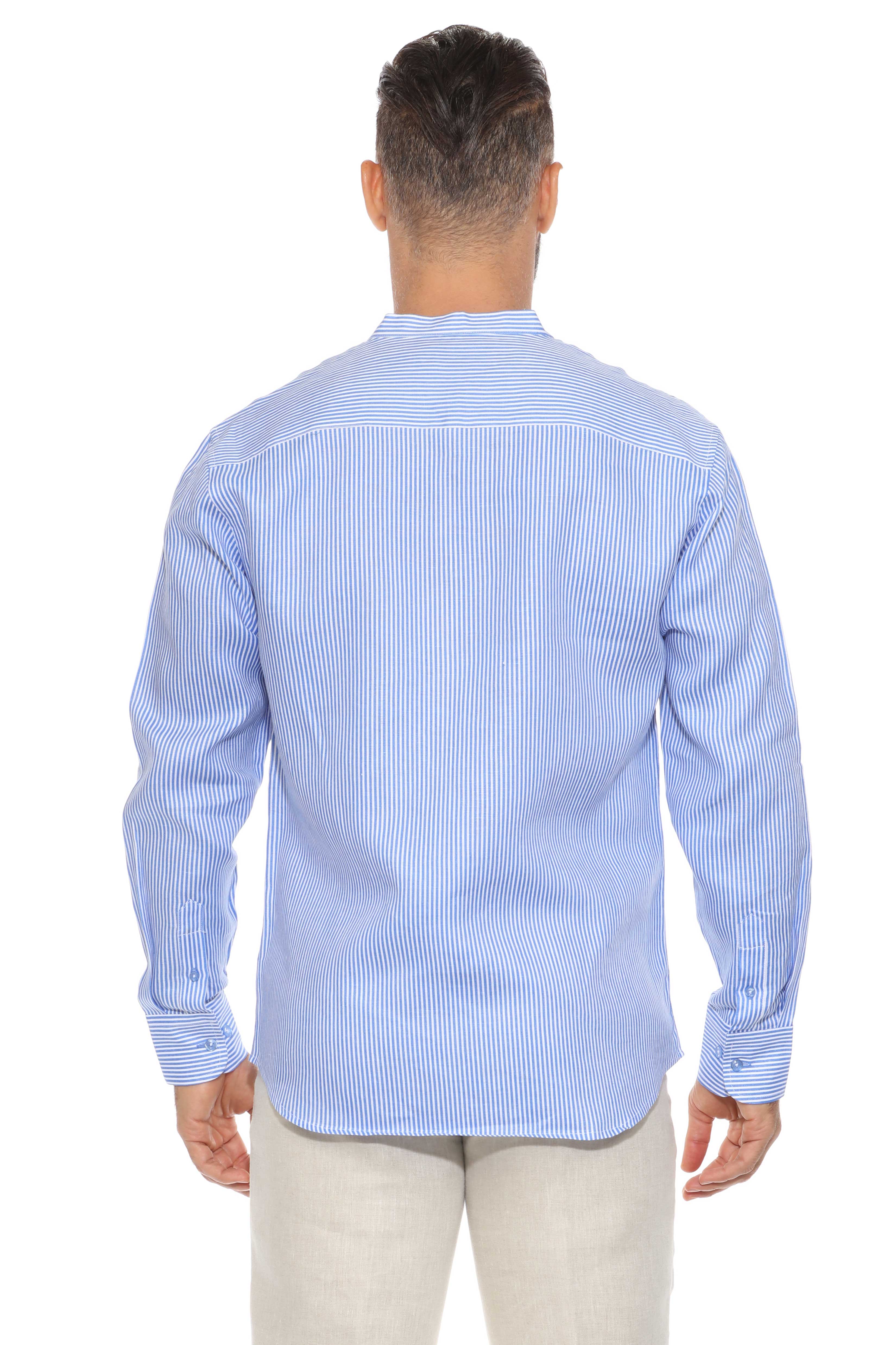 Minimalist elegance meets breathable luxury in this long-sleeved mandarin collar shirt, crafted from 100% premium linen. Designed with refined pinstripes and a clean collarless neckline, it’s the ideal warm-weather piece for relaxed sophistication—perfect for tropical getaways, casual weddings, or elevated daywear.