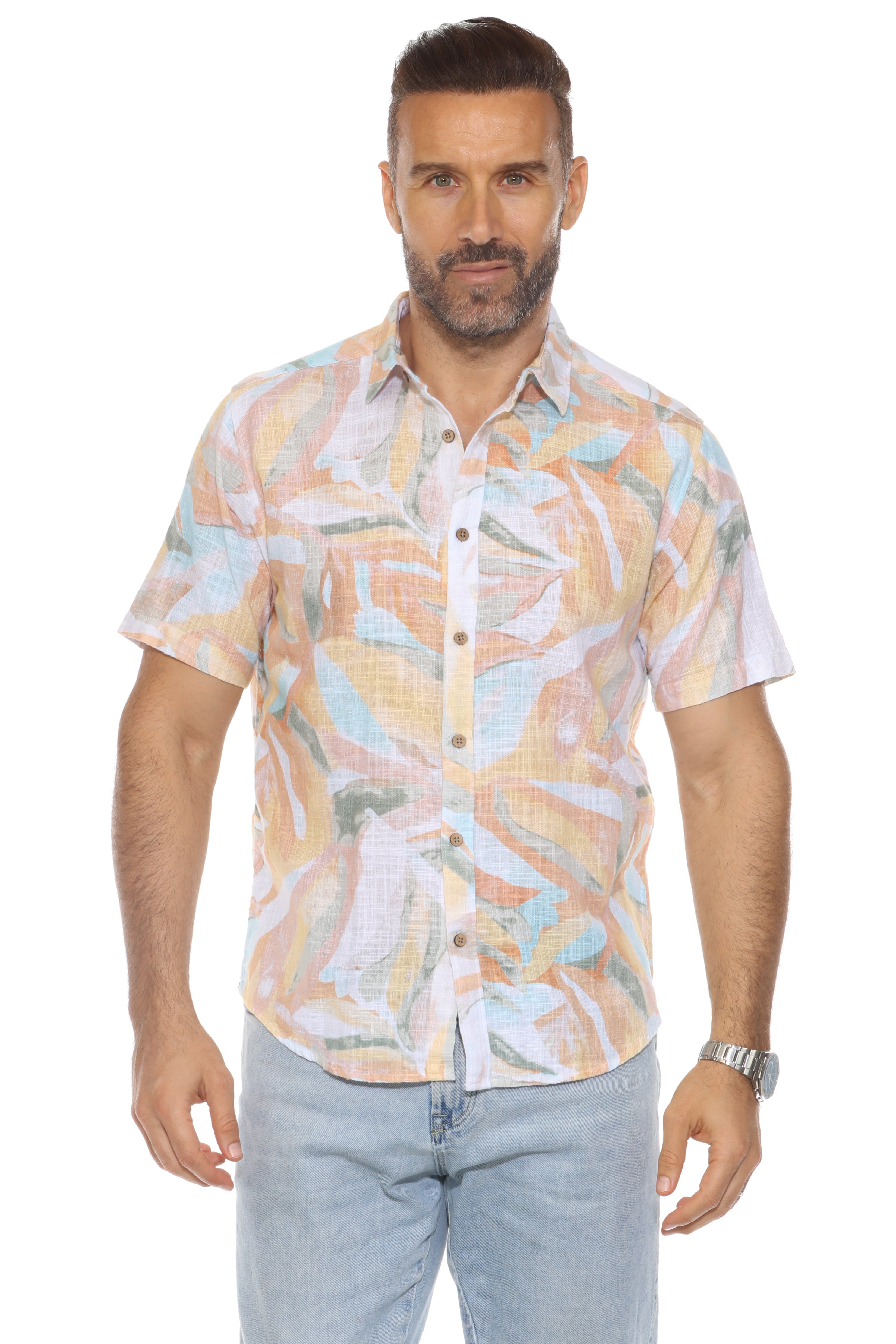 Elevate your resort style with this short sleeve button-up crafted from a lightweight cotton-linen blend. Featuring a crisp leaf print and a casual rolled sleeve, it's designed for effortless warm-weather refinement.