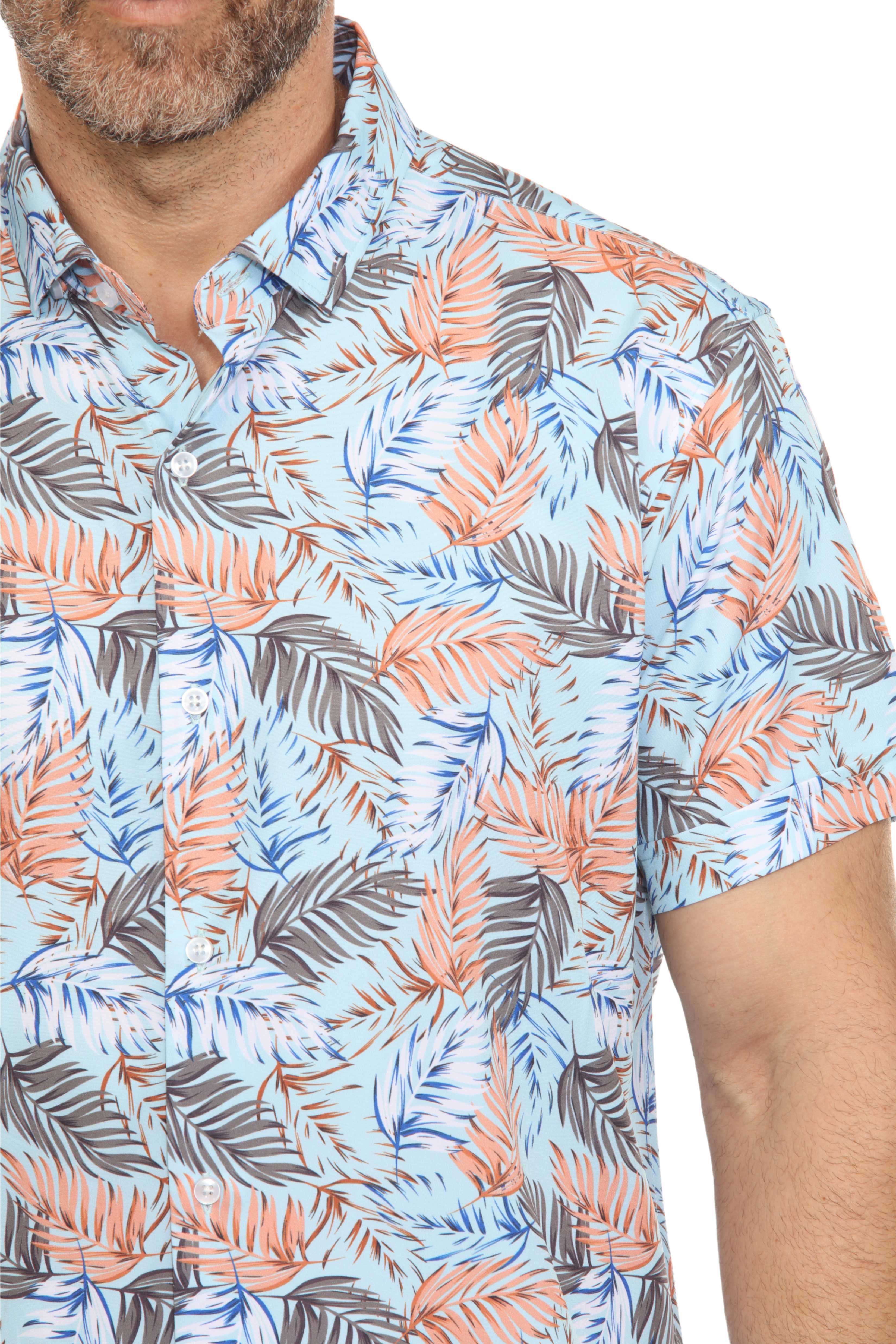 Bold and breathable, this short sleeve shirt features a multi color leafy print on soft textured stretch fabric for next-level comfort and style. Whether you're heading out for a summer hangout or beachside dinner, this shirt brings sharp, modern energy to any laid-back look.