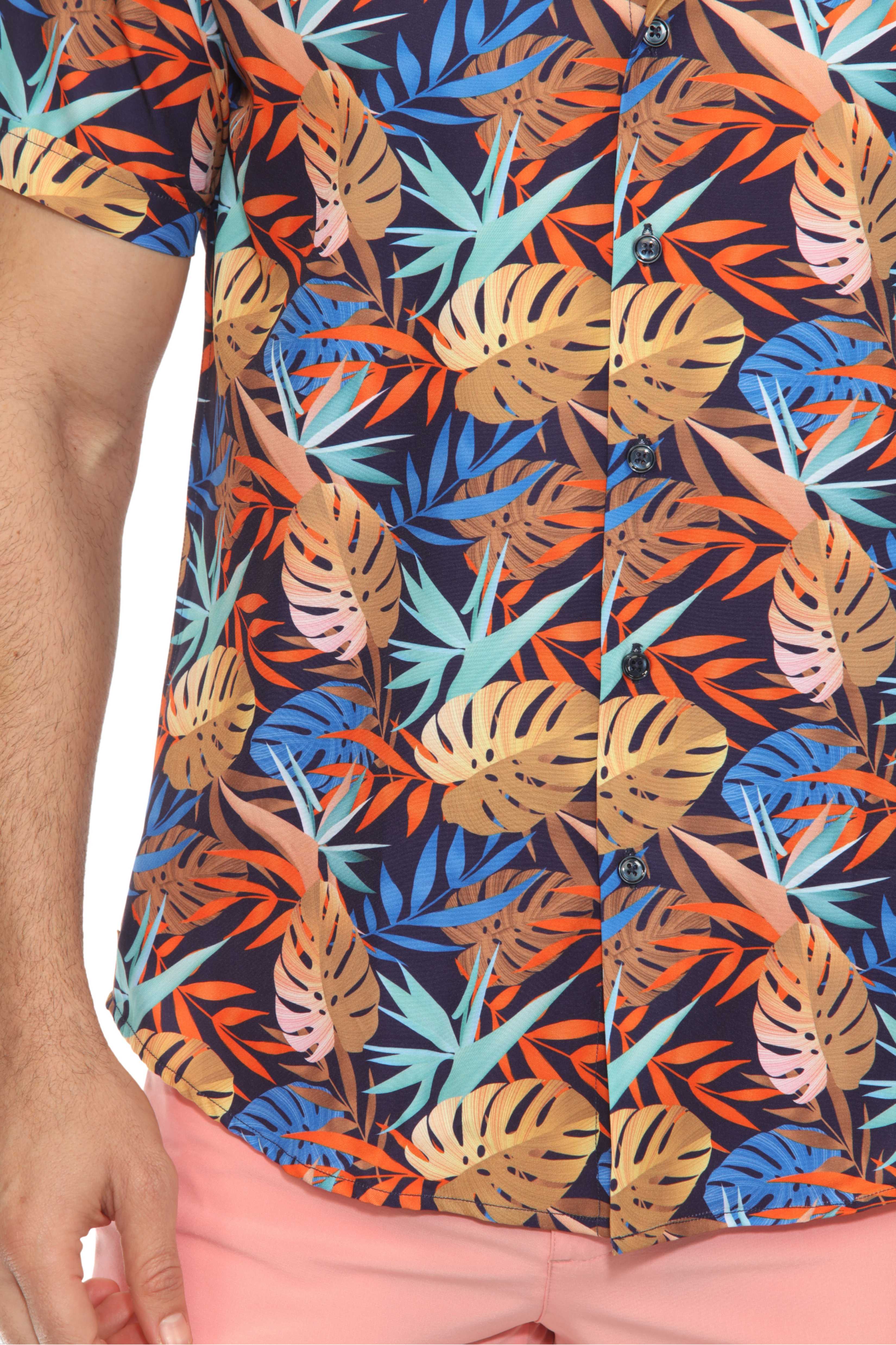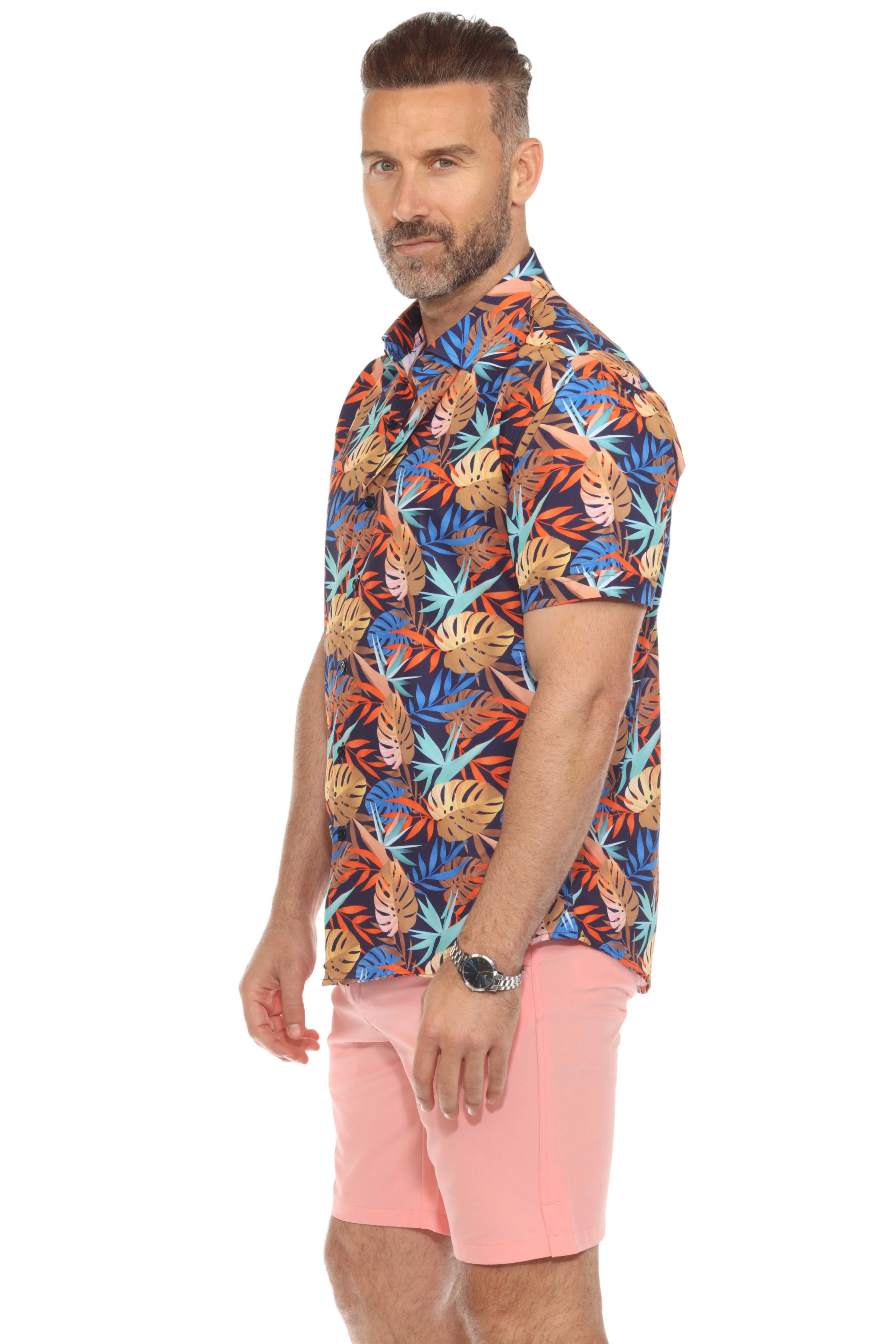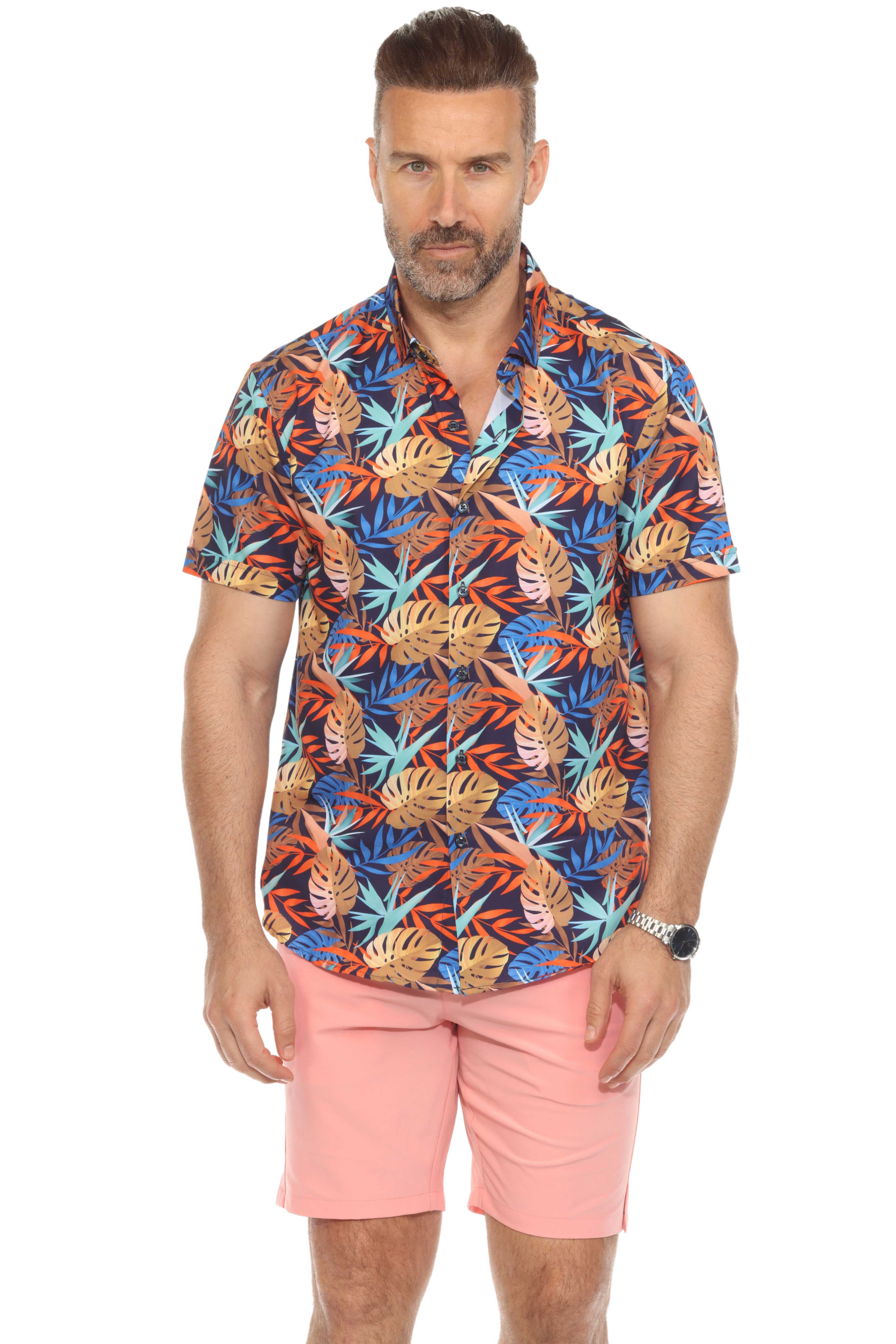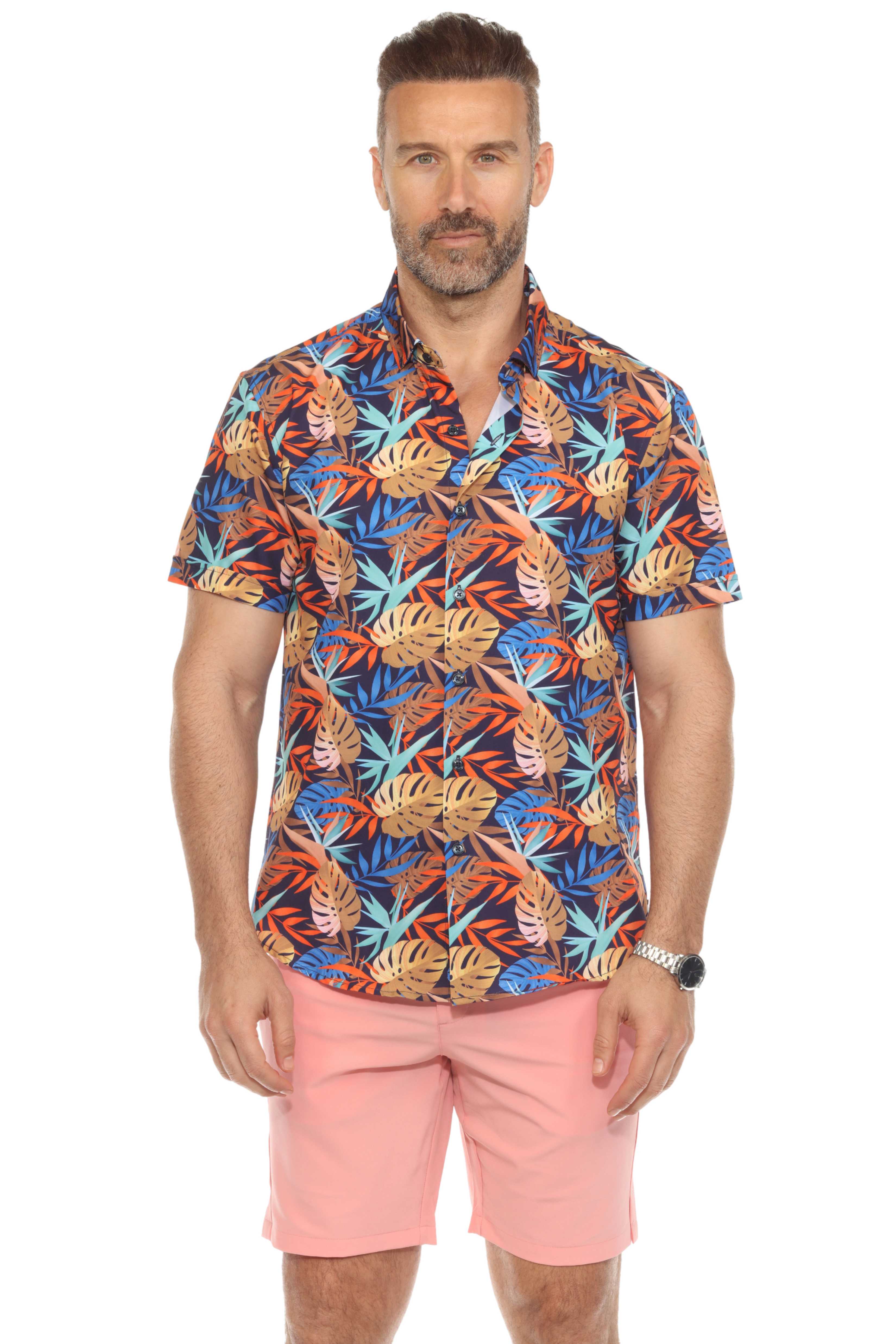 Bold and breathable, this short sleeve shirt features a tropical multi color leafy print on soft textured stretch fabric for next-level comfort and style. Whether you're heading out for a summer hangout or beachside dinner, this shirt brings sharp, modern energy to any laid-back look.
