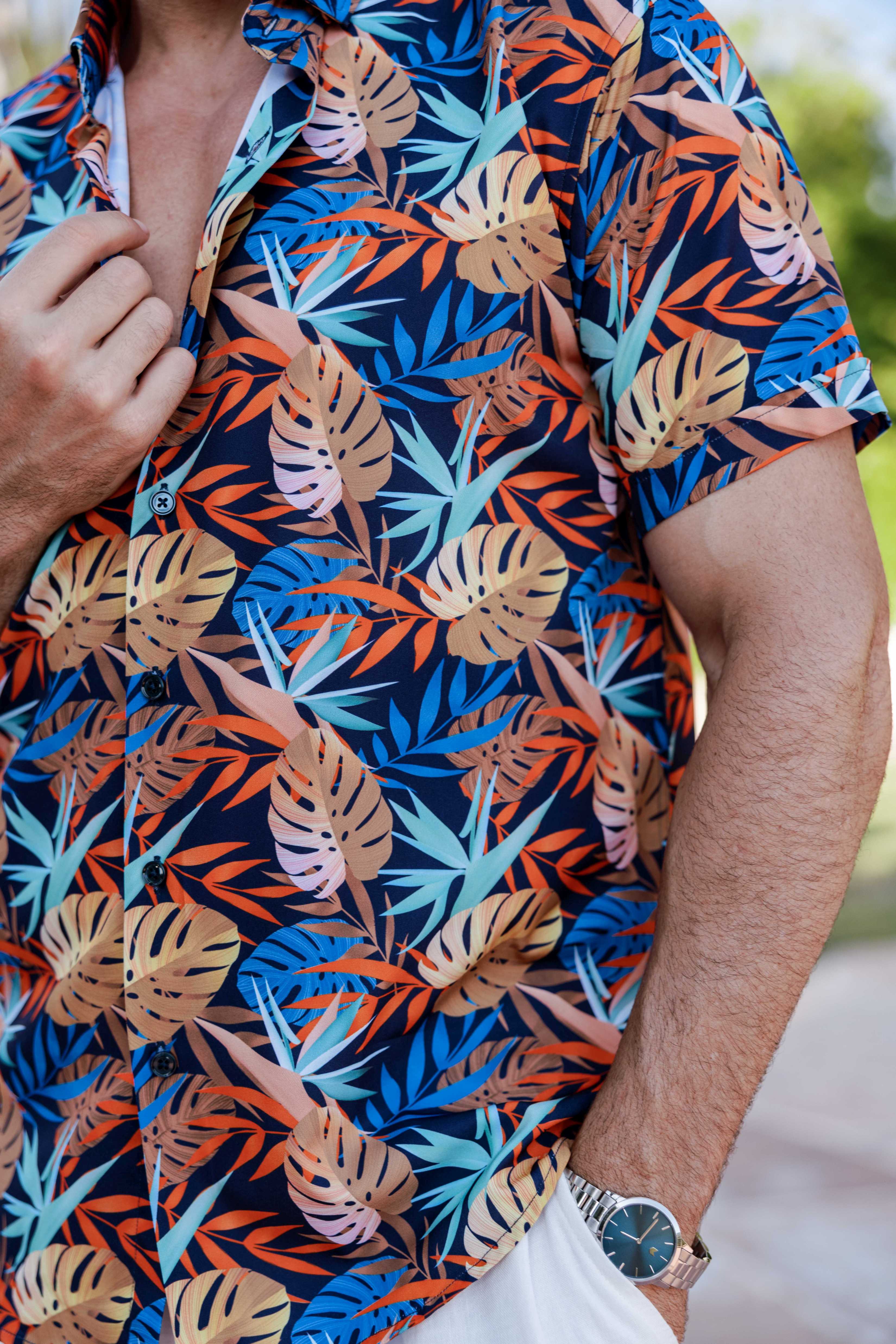 Mojito Lightweight Modern Island Leaf Pattern Print Stretch Shirt