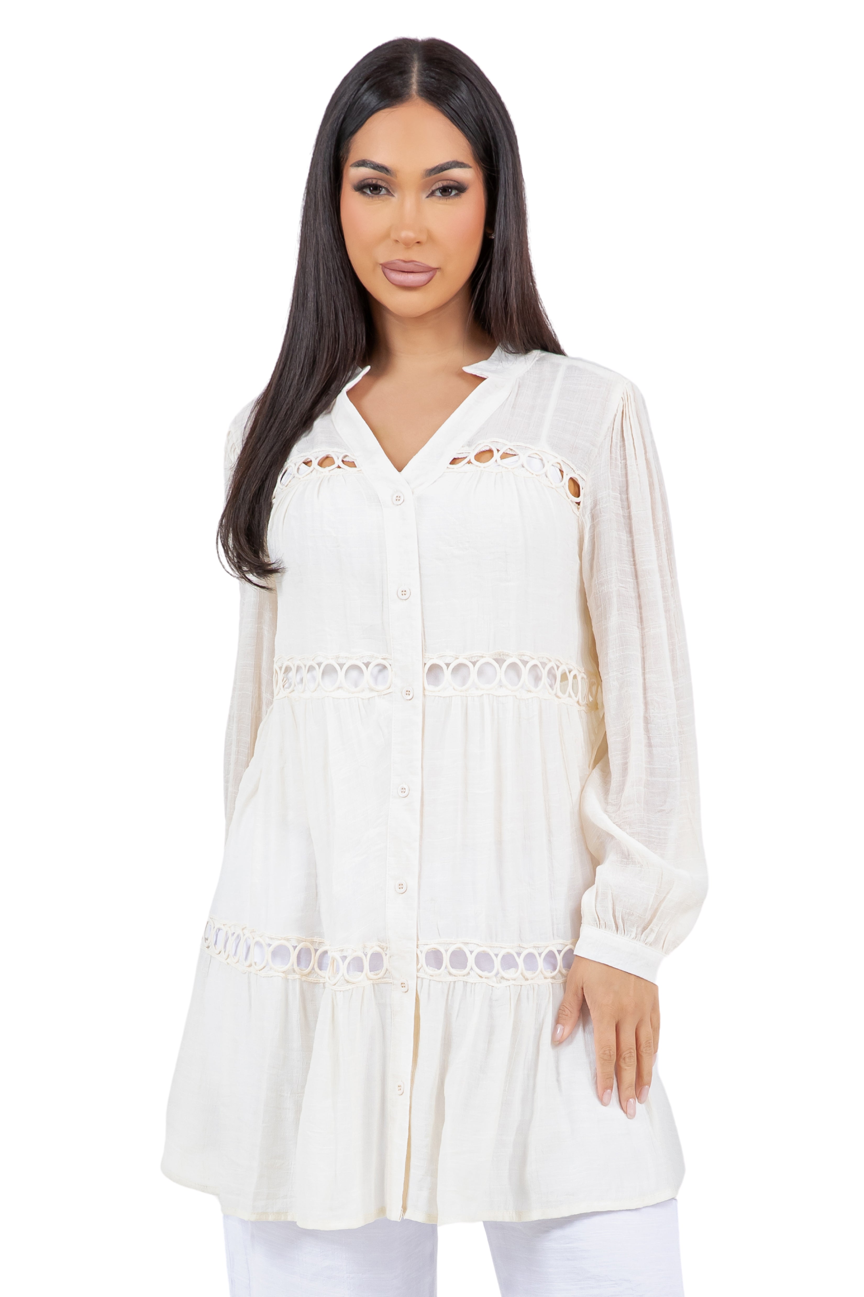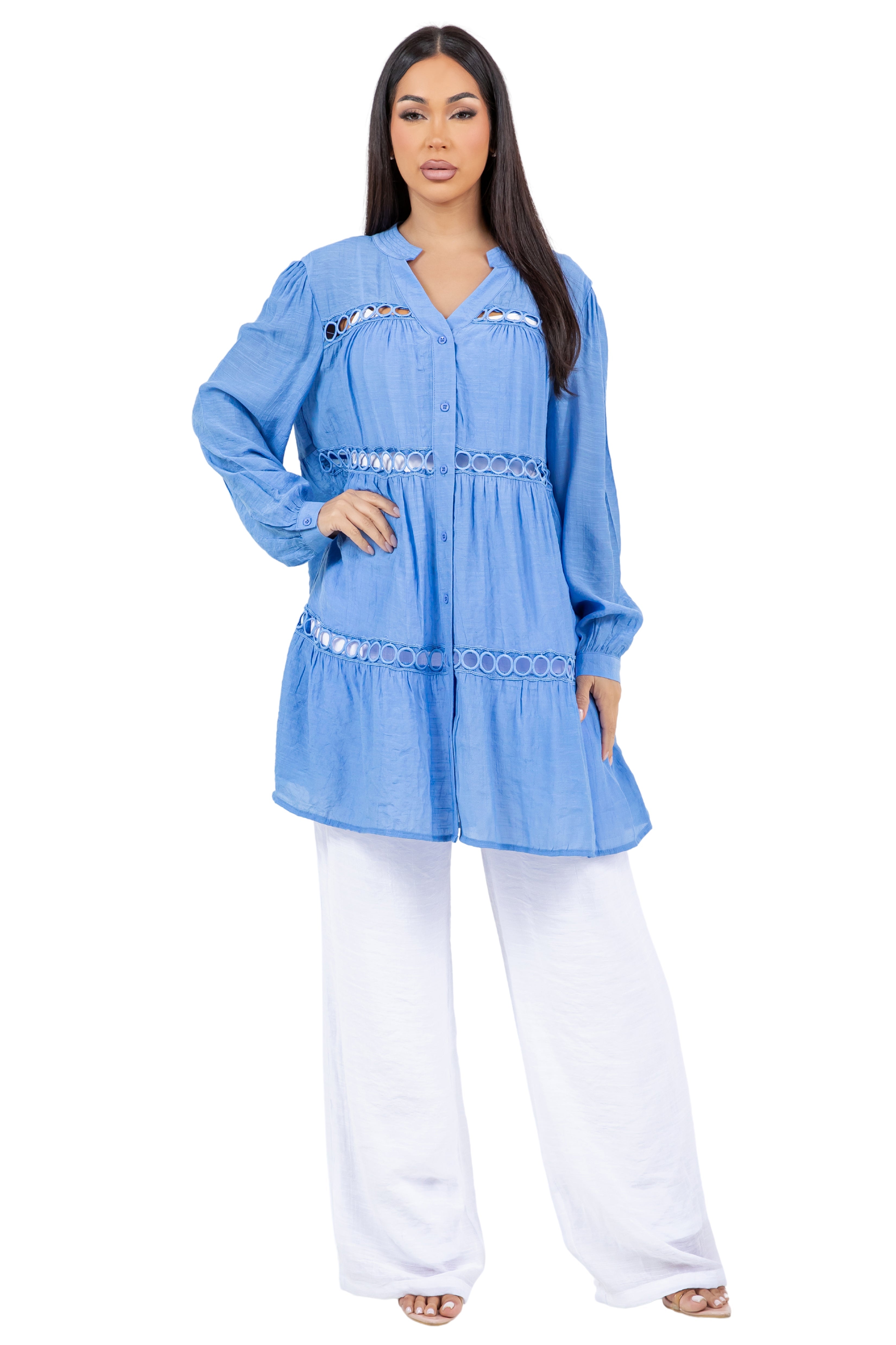 Women's Casual Resort Wear Circle Lace Crochet Detail Tunic Blouse Button Down