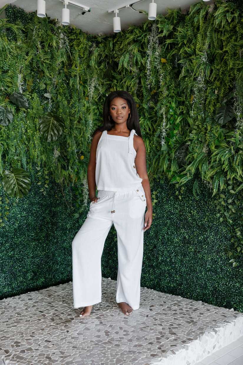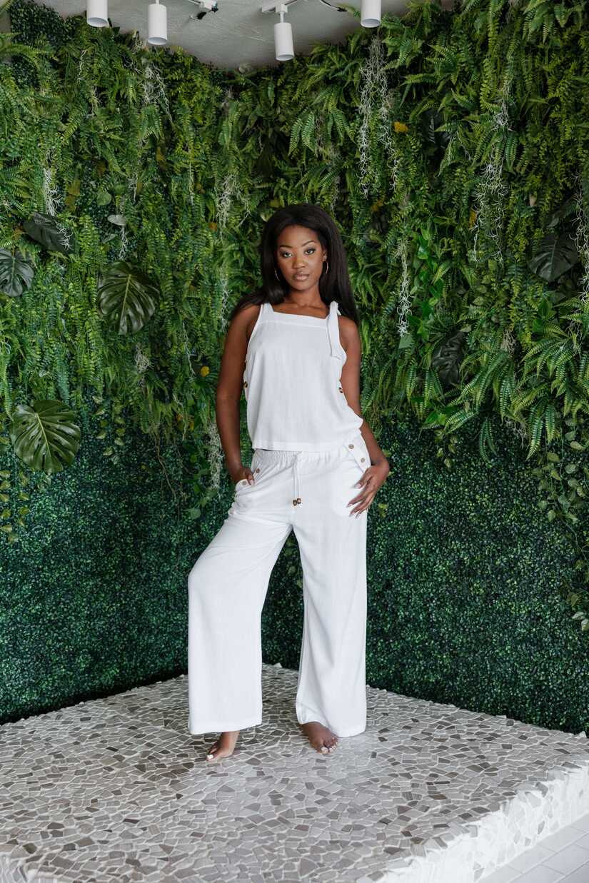 This breezy and elegant linen-blend top is your go-to for a clean, modern summer look. Designed with soft tie straps and eye-catching side button detailing, it offers an airy feel with a touch of sophistication. The relaxed silhouette and breathable fabric blend make it ideal for warm-weather styling.
