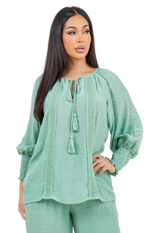Women's Casual Resort Wear Boho Tassel Peasant Blouse with Lace Trim and Smocked Sleeves