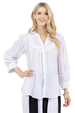 Women's Casual Resort Wear Boho Blouse Button Down with Crochet Lace Trim and 3/4 Sleeves