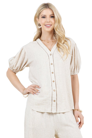Women's Casual Tie Strap Button Detail Linen-Blend Top