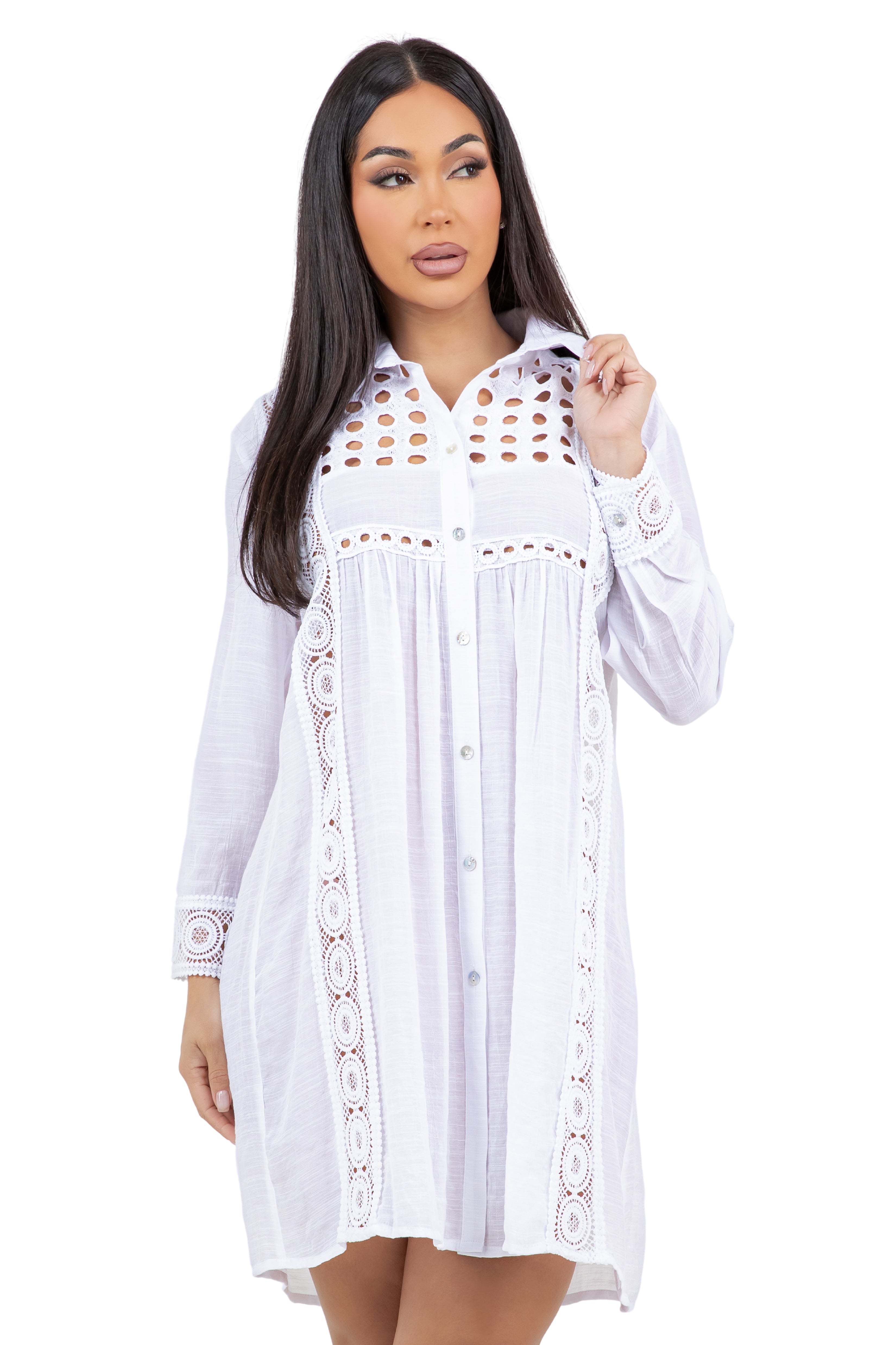 Women's Casual Resort Wear Embroidered Lace Yoke Button Down Shirt Dress