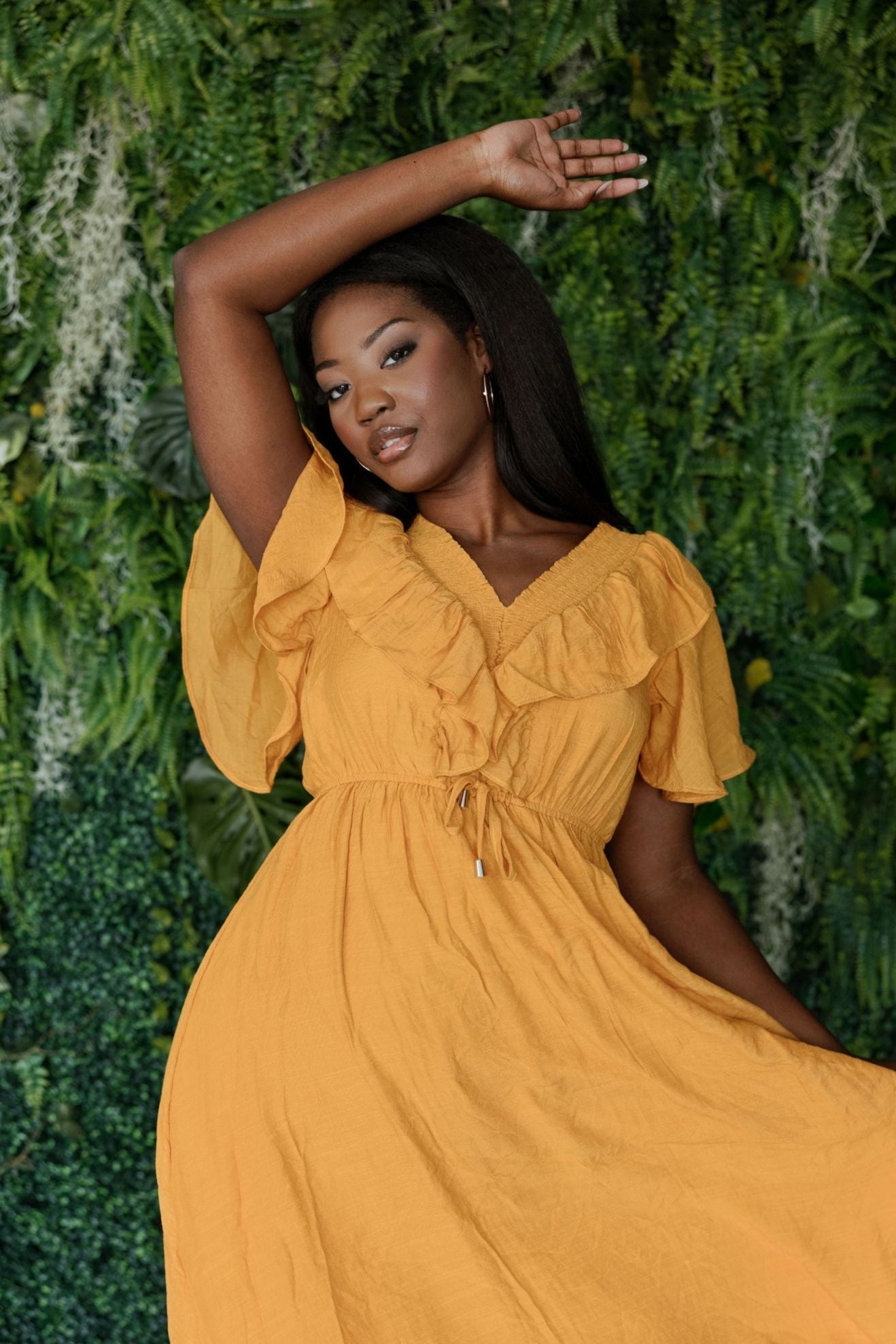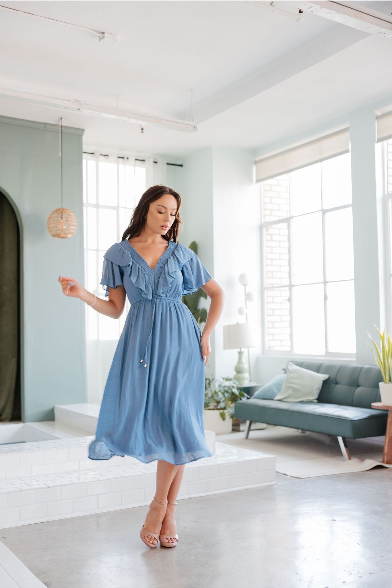 Women's Casual Resort Wear V Shaped Neckline Smocked Ruffled Empire Dress Mid Length with Drawstring Waist