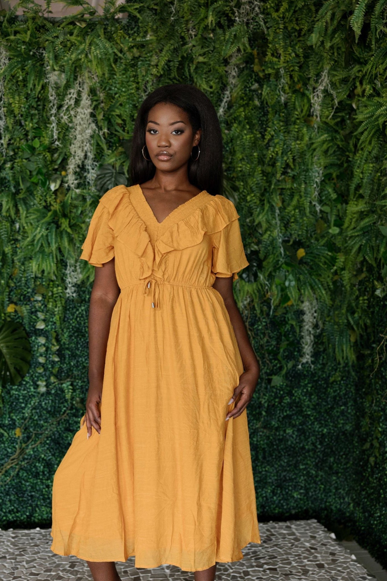 Mojito Women's Casual Resort Wear V Shaped Neckline Smocked Ruffled Empire Dress Mid Length with Drawstring Waist