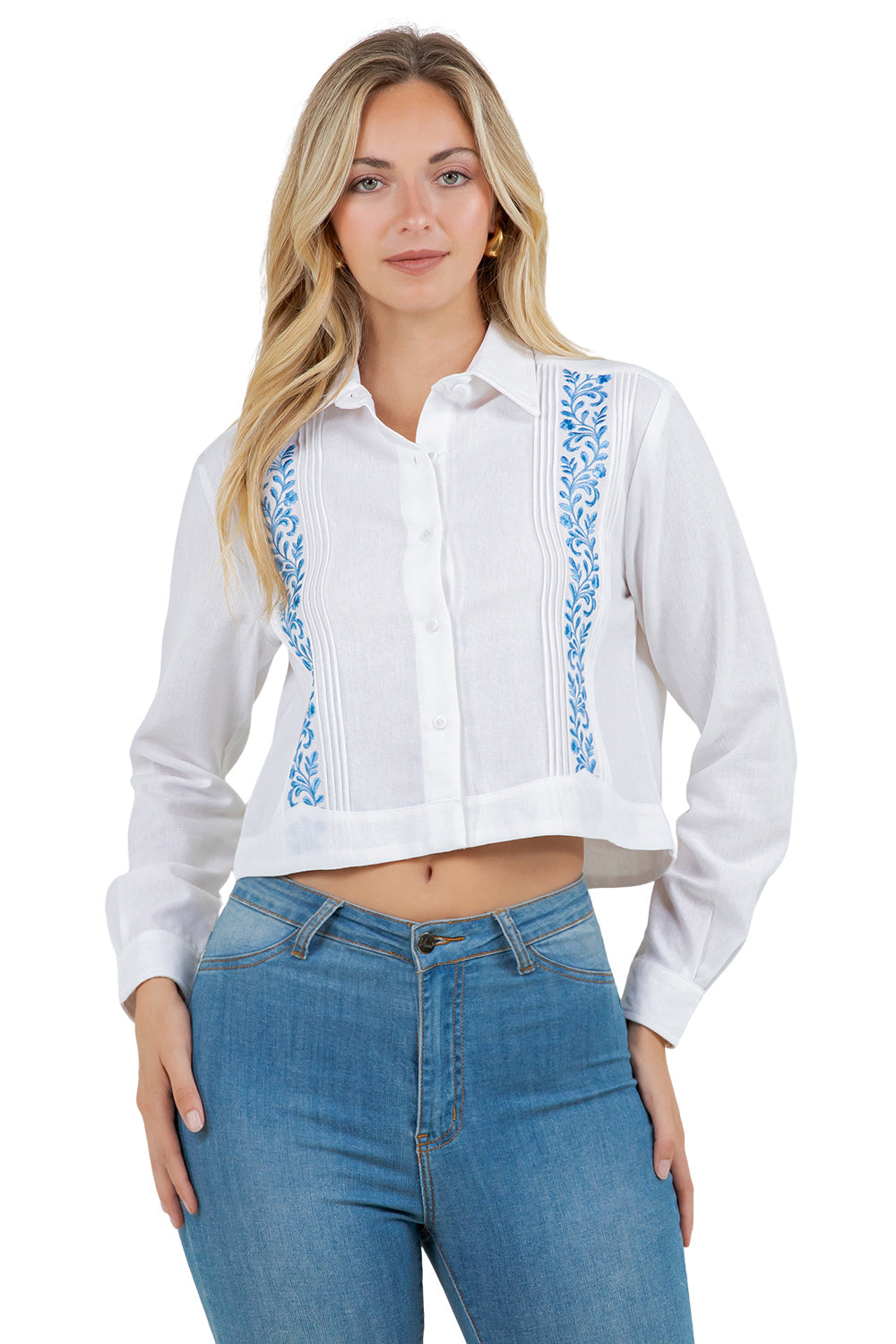 Signature Guayabera Style: Features classic vertical pintuck paired with traditional embroidered blue floral detailing down the front panels.